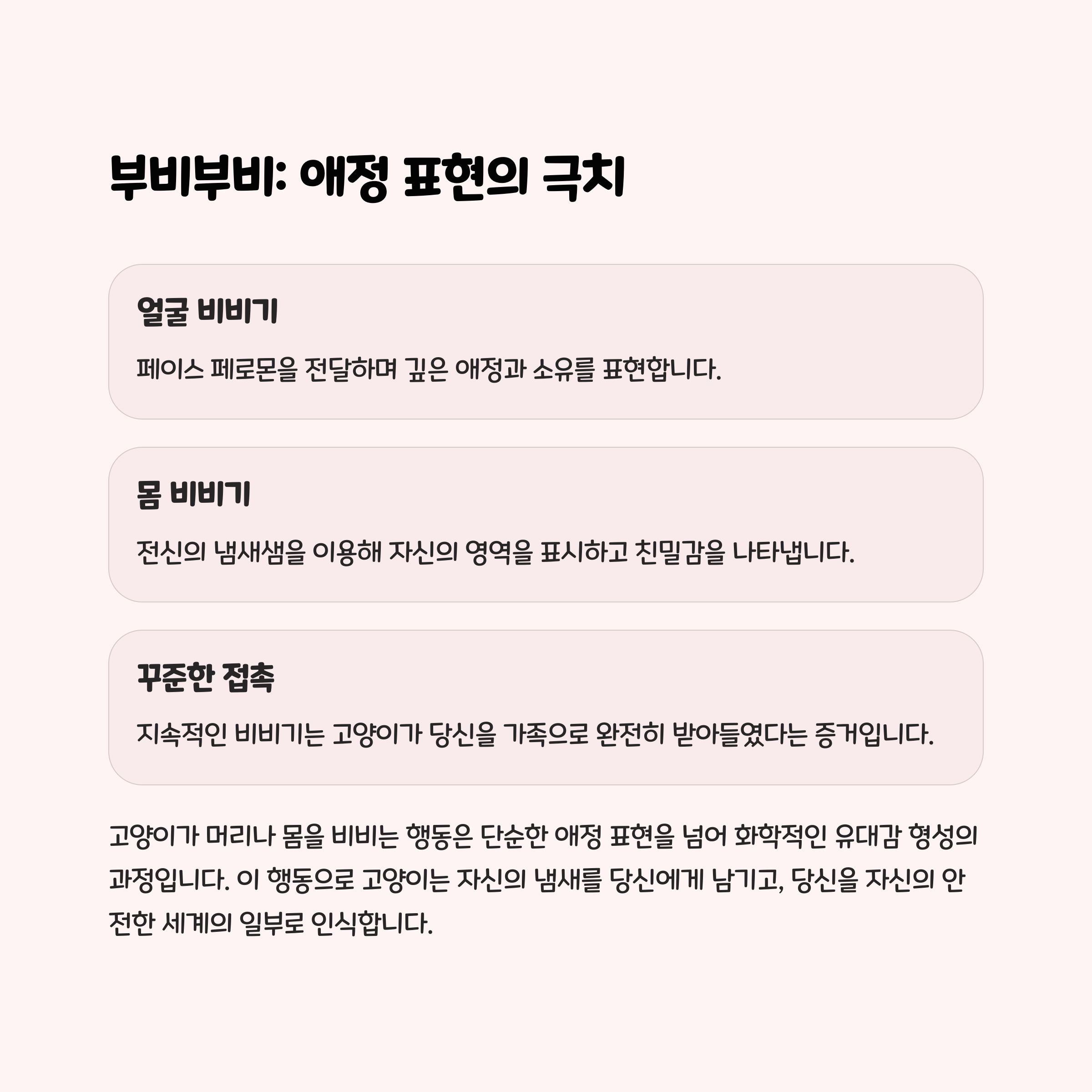 고양이가 집사의 다리나 손, 얼굴에 머리 또는 몸을 비비는 행동은 강한 애정의 표현입니다. 이 행동은 ‘헤드번팅’ 또는 ‘알로 러빙’이라고 하며, 자신의 냄새를 묻혀 소유욕을 나타내기도 하고, 집사를 가족으로 인식한다는 신호입니다. 또한, 집사가 귀가했을 때 다가와 몸을 비비는 것은 반가움과 기쁨의 표시입니다.