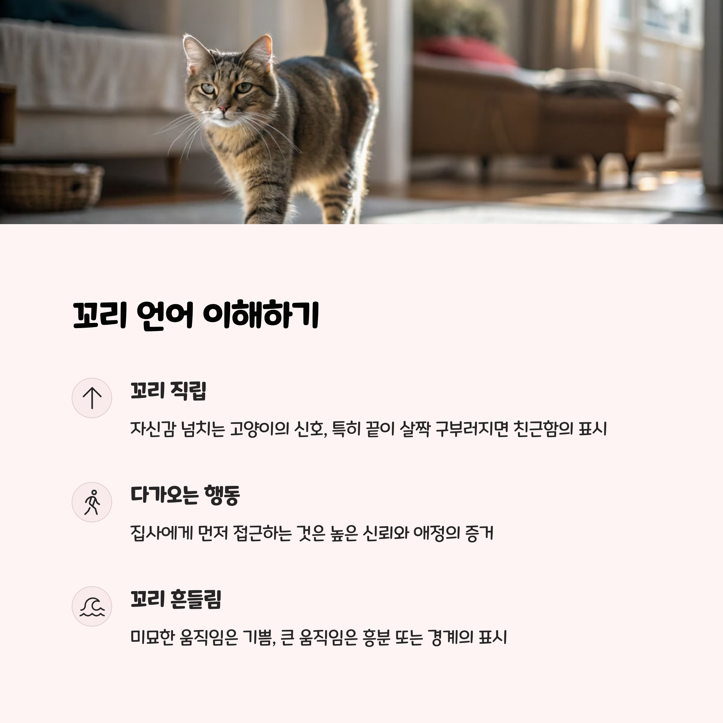 고양이는 꼬리로 감정을 표현합니다. 꼬리가 위로 곧게 세워져 있거나 끝이 살짝 구부러진 U자형을 그릴 때, 이는 기분이 좋고 집사에게 반가움을 느낀다는 신호입니다. 반대로 꼬리를 낮게 내리거나 흔들면 불안이나 불만의 표시이니, 꼬리의 각도와 움직임을 잘 관찰해야 합니다.