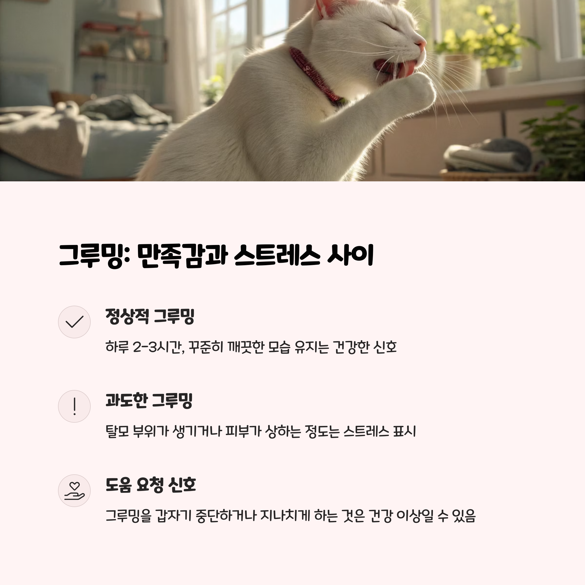 - 그루밍(셀프 미용) : 하루 평균 2시간 30분(전체 시간의 약 10%) 이상을 그루밍에 사용.