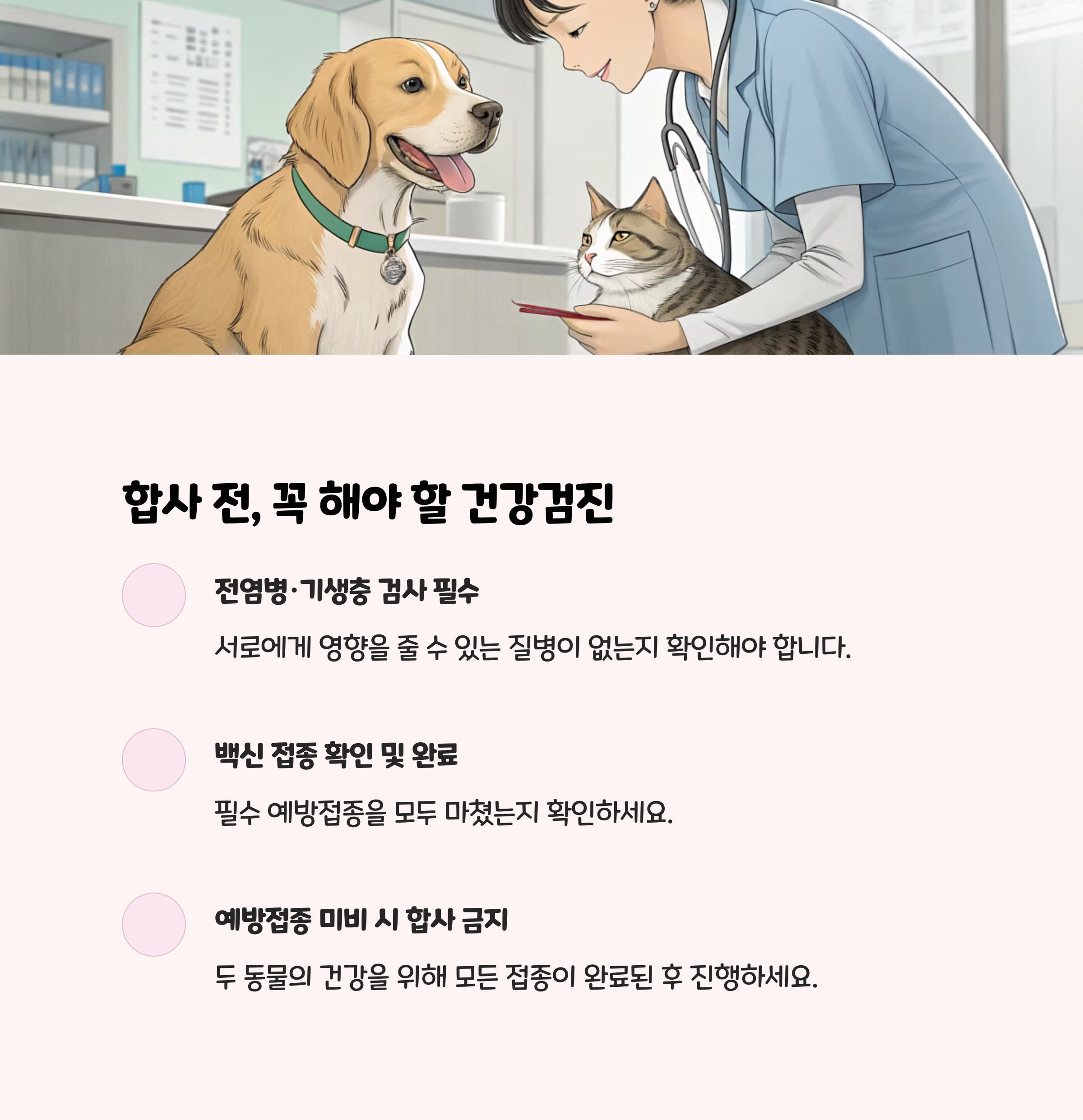 처음부터 서두르지 말 것: 평균적으로 합사에는 3~6주가 소요됩니다.공용 공간은 충분히 넓게: 탈출 경로와 숨을 수 있는 공간을 마련하세요.긍정적 경험 강화: 간식, 칭찬, 놀이로 좋은 기억을 심어주세요.환경 변화 시 페로몬 디퓨저 활용: 고양이와 강아지 모두 안정감을 느낄 수 있습니다.
