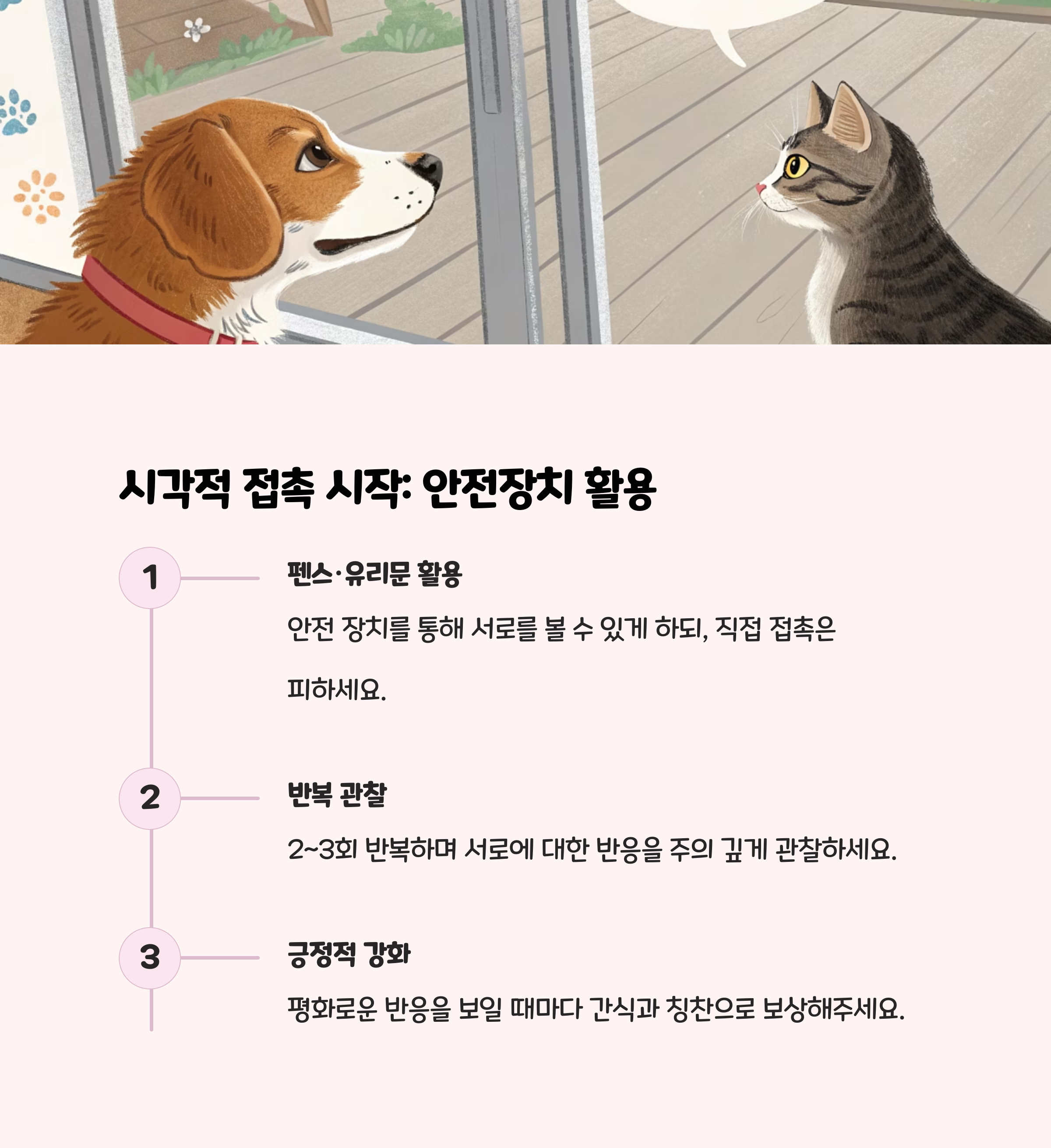 투명한 문이나 안전망을 사이에 두고 서로를 관찰하게 합니다. 이때 간식이나 장난감 등 긍정적인 경험을 연결해 주면, 두 동물 모두 상대에 대한 불안감을 줄일 수 있습니다.