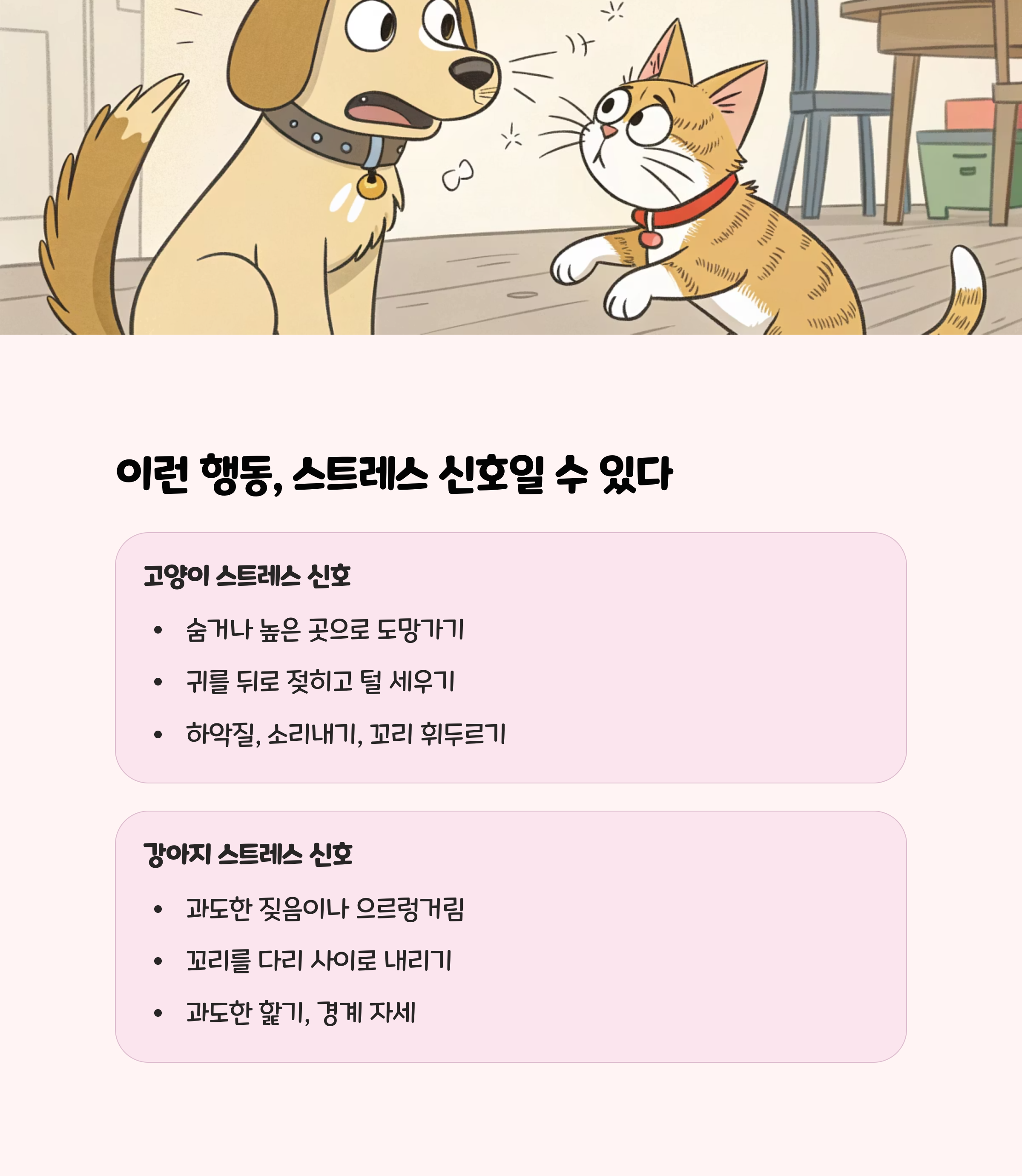 고양이: 숨기, 식욕 저하, 공격성, 과도한 그루밍, 구토 등강아지: 짖음 증가, 식욕 저하, 마킹, 불안 행동 등