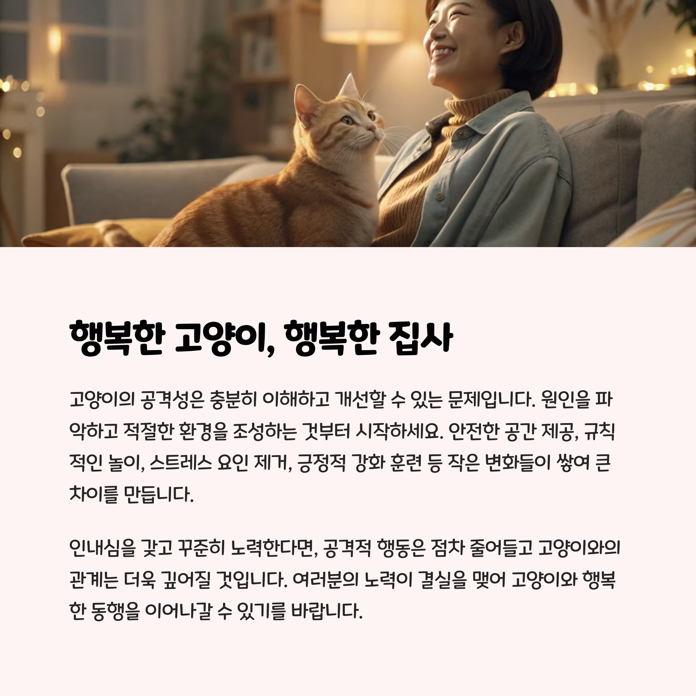 고양이의 공격성 문제는 다양한 원인에서 비롯되지만, 적절한 환경 조성과 놀이, 훈련을 통해 충분히 개선할 수 있습니다. 반려인의 사랑과 인내심은 무엇보다 중요하며, 이를 통해 고양이와의 신뢰를 쌓고 문제를 해결할 수 있습니다. 꾸준한 노력으로 반려묘와 행복한 동행을 이어가세요!