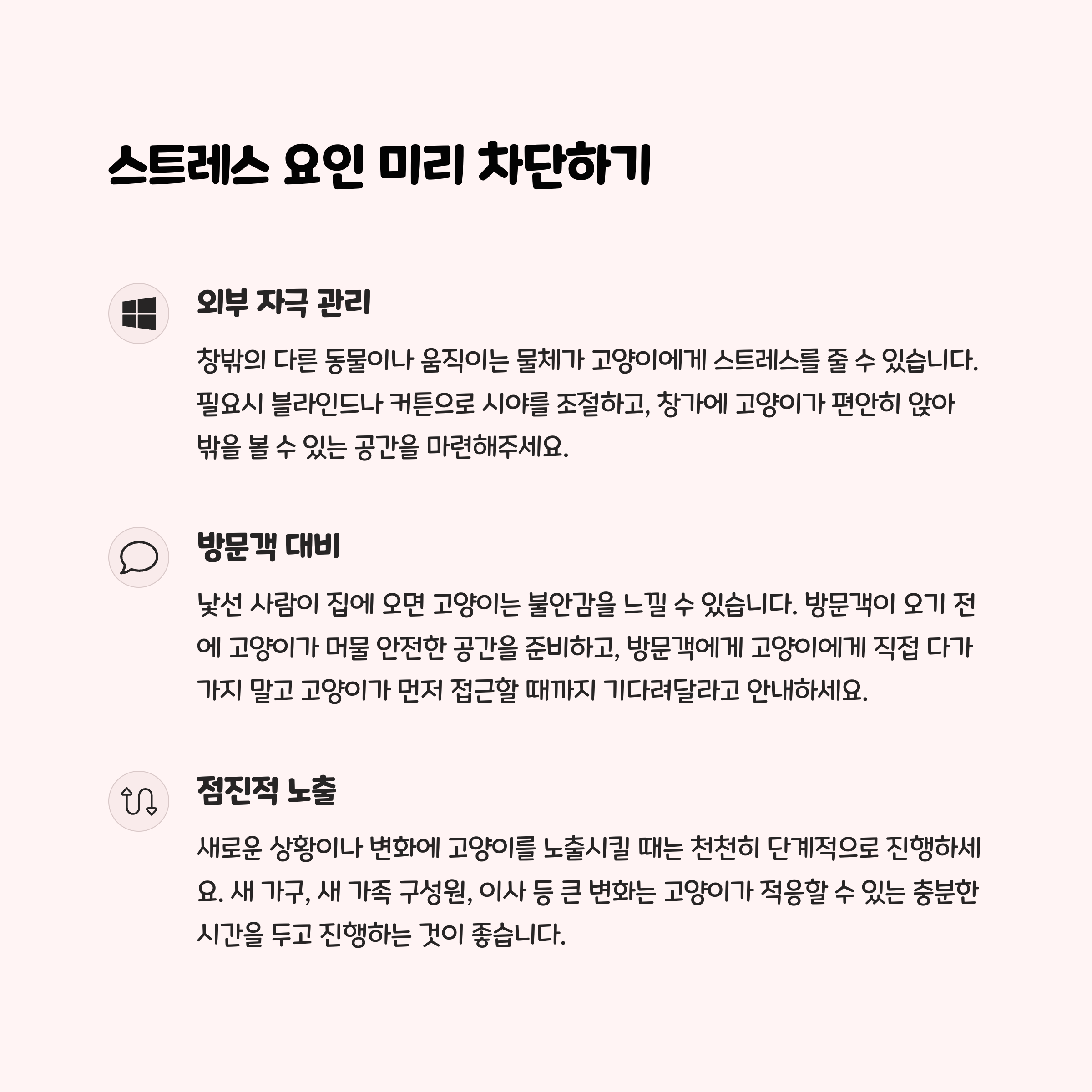 낯선 사람이나 동물의 접근을 조절하고, 새로운 환경 변화는 천천히 진행하세요.