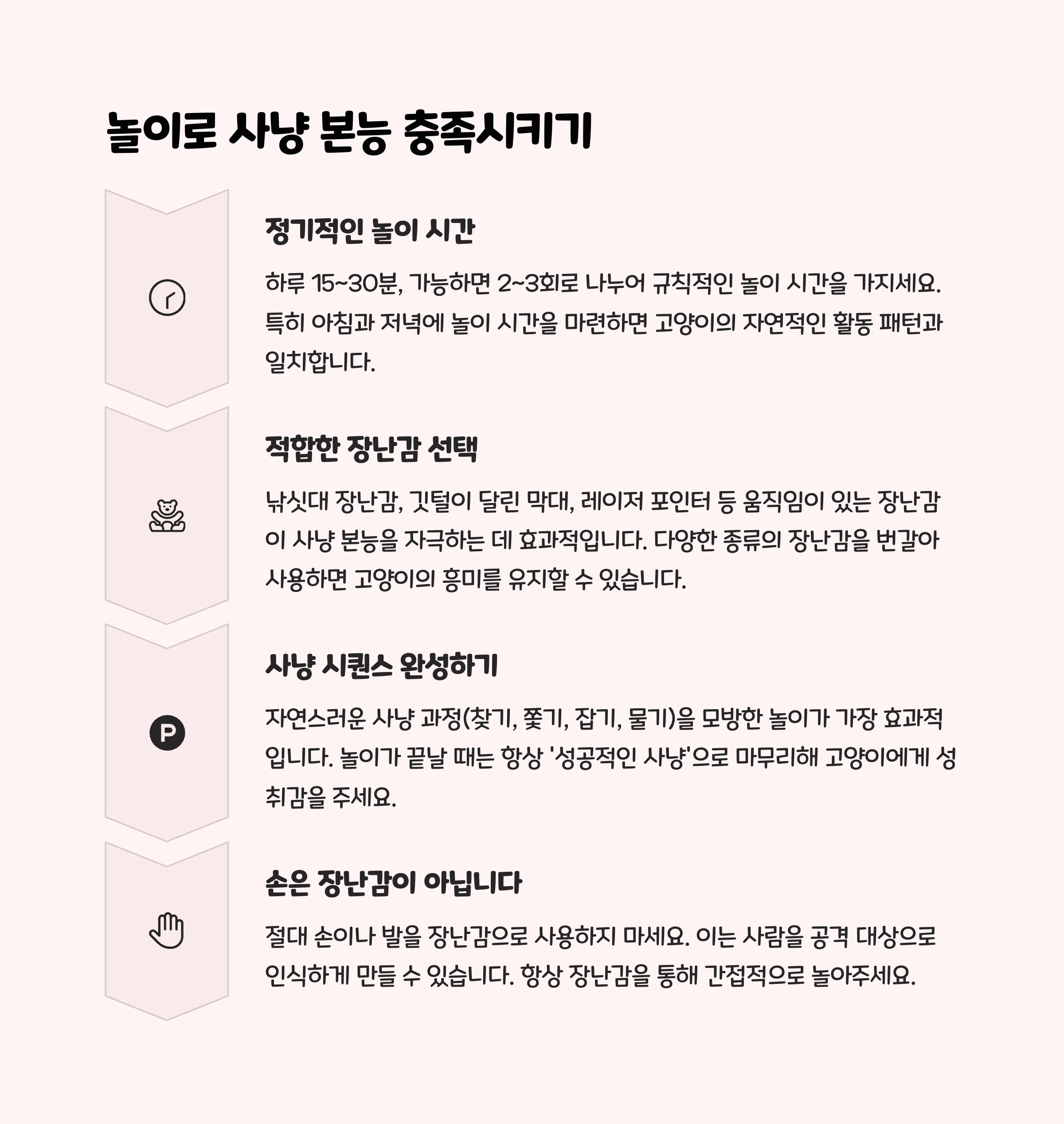 낚싯대 장난감, 레이저 포인터 등을 사용하여 고양이의 에너지를 발산시키세요. 하루 15~30분 정도 규칙적으로 놀아주는 것이 좋습니다.