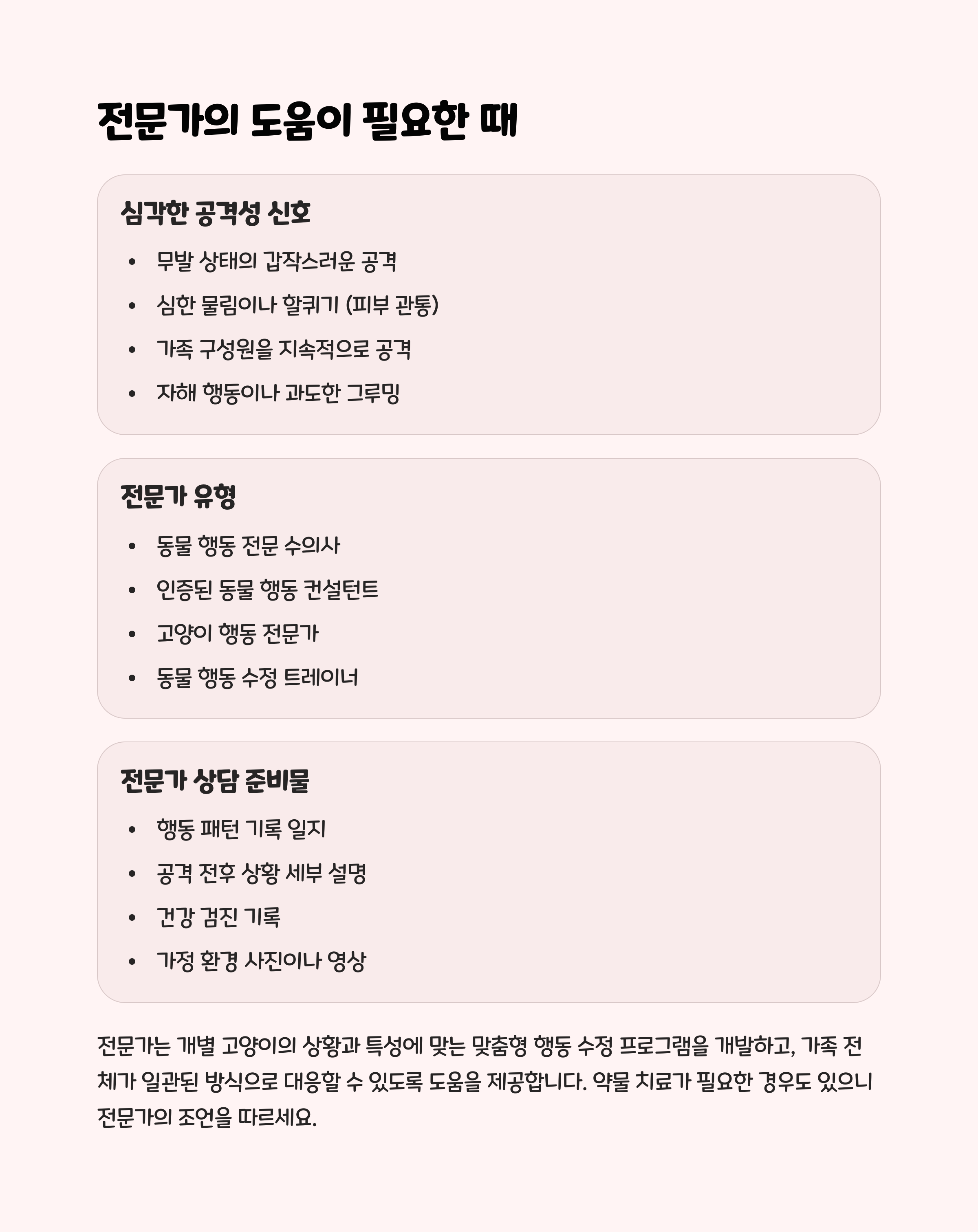 가정 내에서 환경 개선, 놀이, 훈련 등 다양한 방법을 시도했음에도 불구하고 고양이의 공격성이 전혀 개선되지 않거나, 가족이나 다른 동물에게 심각한 위협이 될 경우, 동물 행동 전문가(수의 행동의학 전문의, 행동 상담가)나 수의사의 도움을 받아야 합니다. 전문가의 진단과 맞춤형 교정 프로그램, 필요시 약물 치료를 통해 문제를 해결할 수 있습니다.