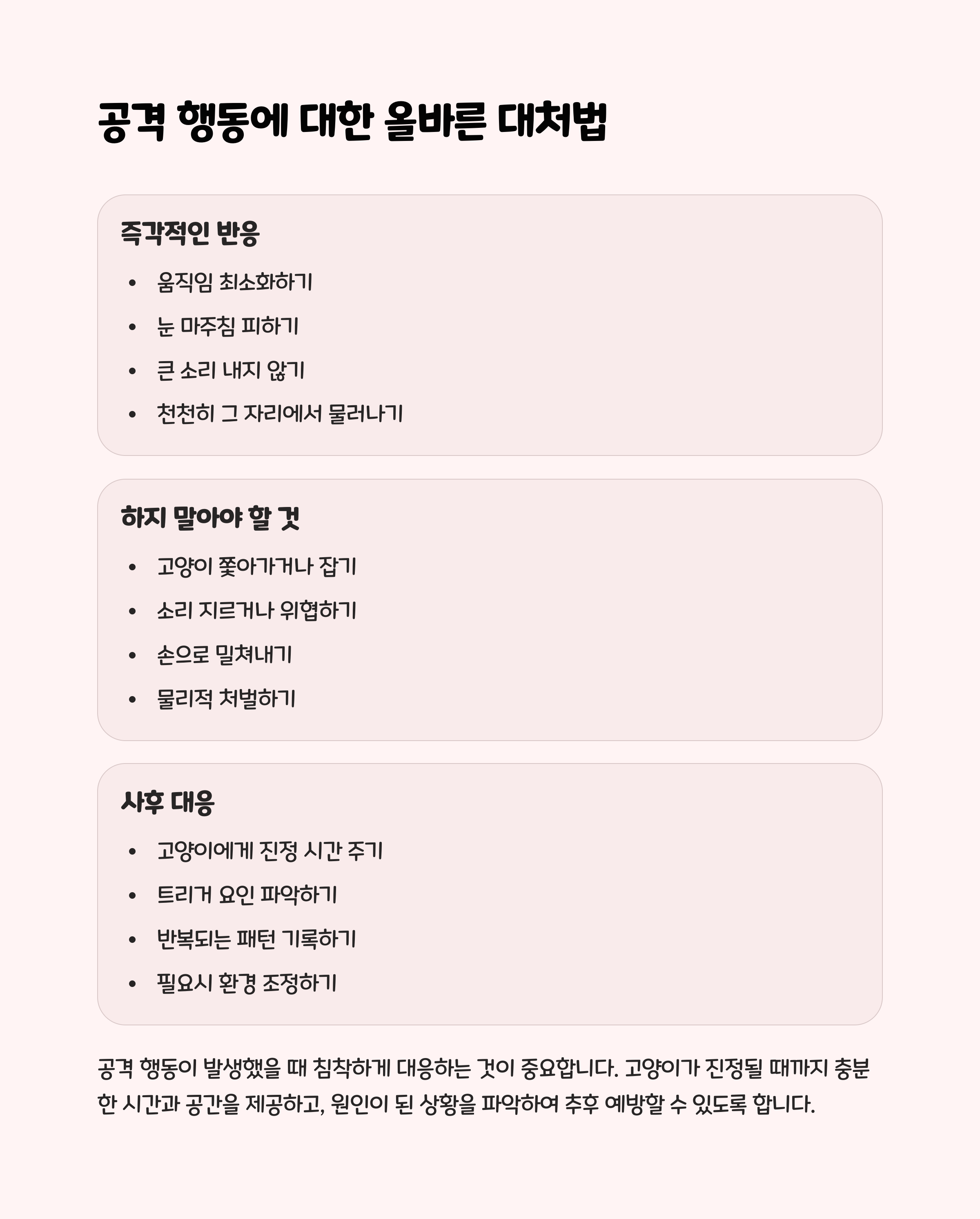 고양이의 공격성 문제는 다양한 원인에서 비롯되지만, 적절한 환경 조성과 놀이, 훈련을 통해 충분히 개선할 수 있습니다. 반려인의 사랑과 인내심은 무엇보다 중요하며, 이를 통해 고양이와의 신뢰를 쌓고 문제를 해결할 수 있습니다. 꾸준한 노력으로 반려묘와 행복한 동행을 이어가세요!