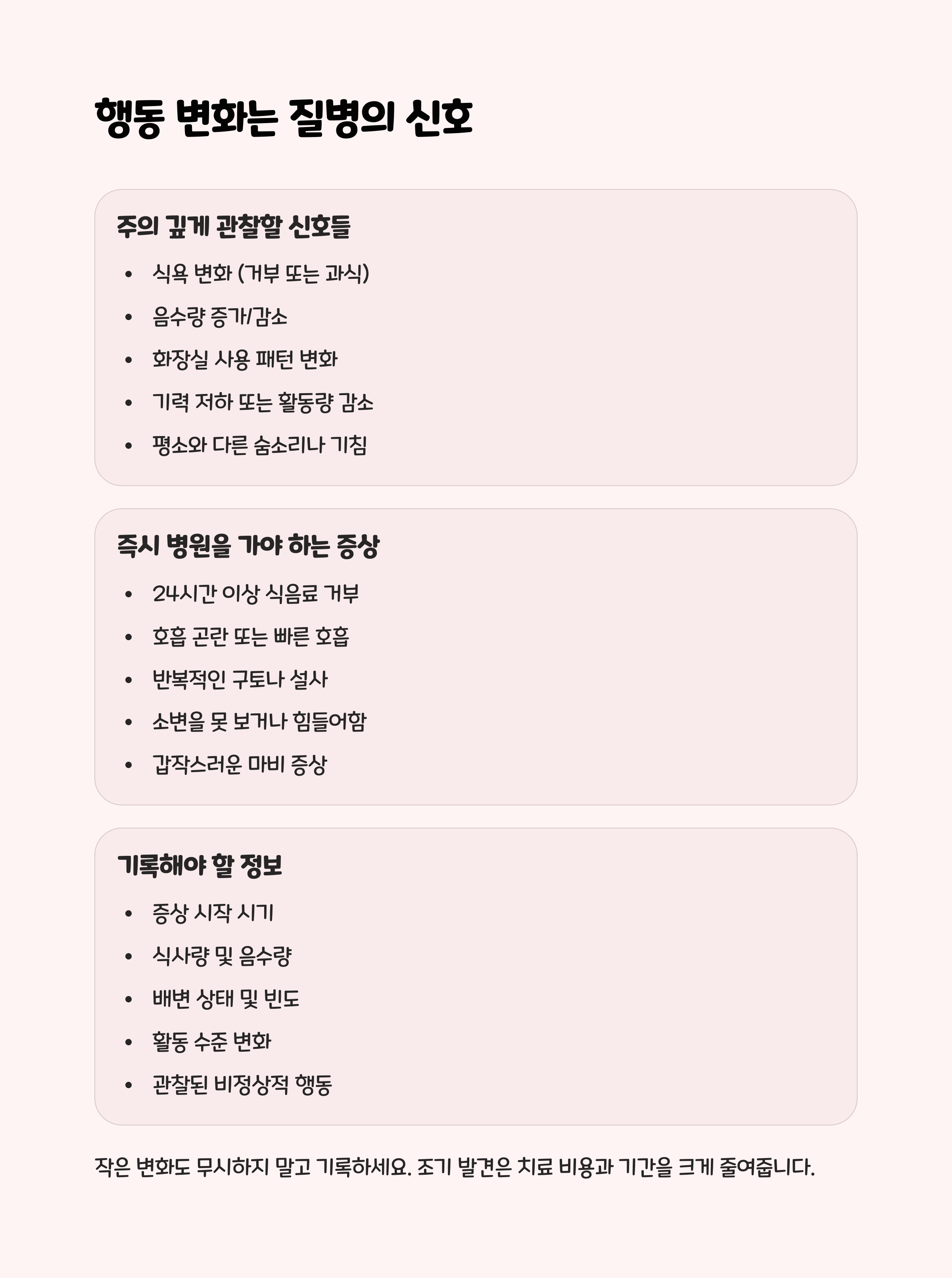 실천 팁 : 고양이의 행동 변화를 기록하고 의심스러운 증상이 나타나면 바로 상담하세요.
