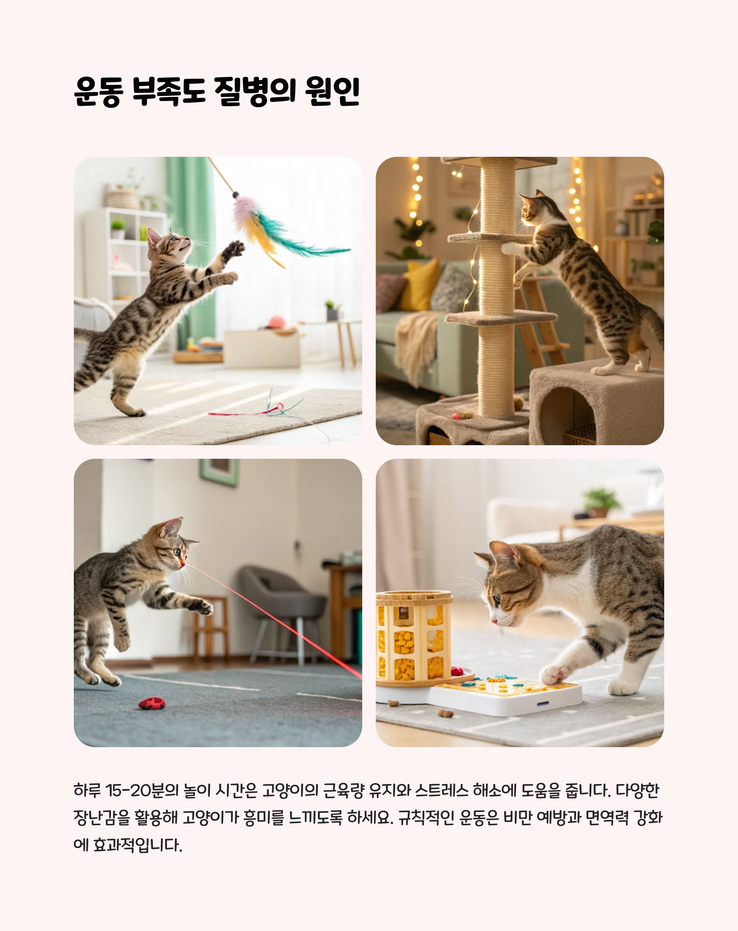 비만은 관절염, 당뇨병, 심혈관 질환 등 다양한 건강 문제를 유발할 수 있습니다. 체중 관리는 병원비 절감뿐 아니라 고양이의 삶의 질 향상에도 중요합니다. 비만 예방을 위해 식단 조절과 놀이를 통한 운동을 병행하세요.