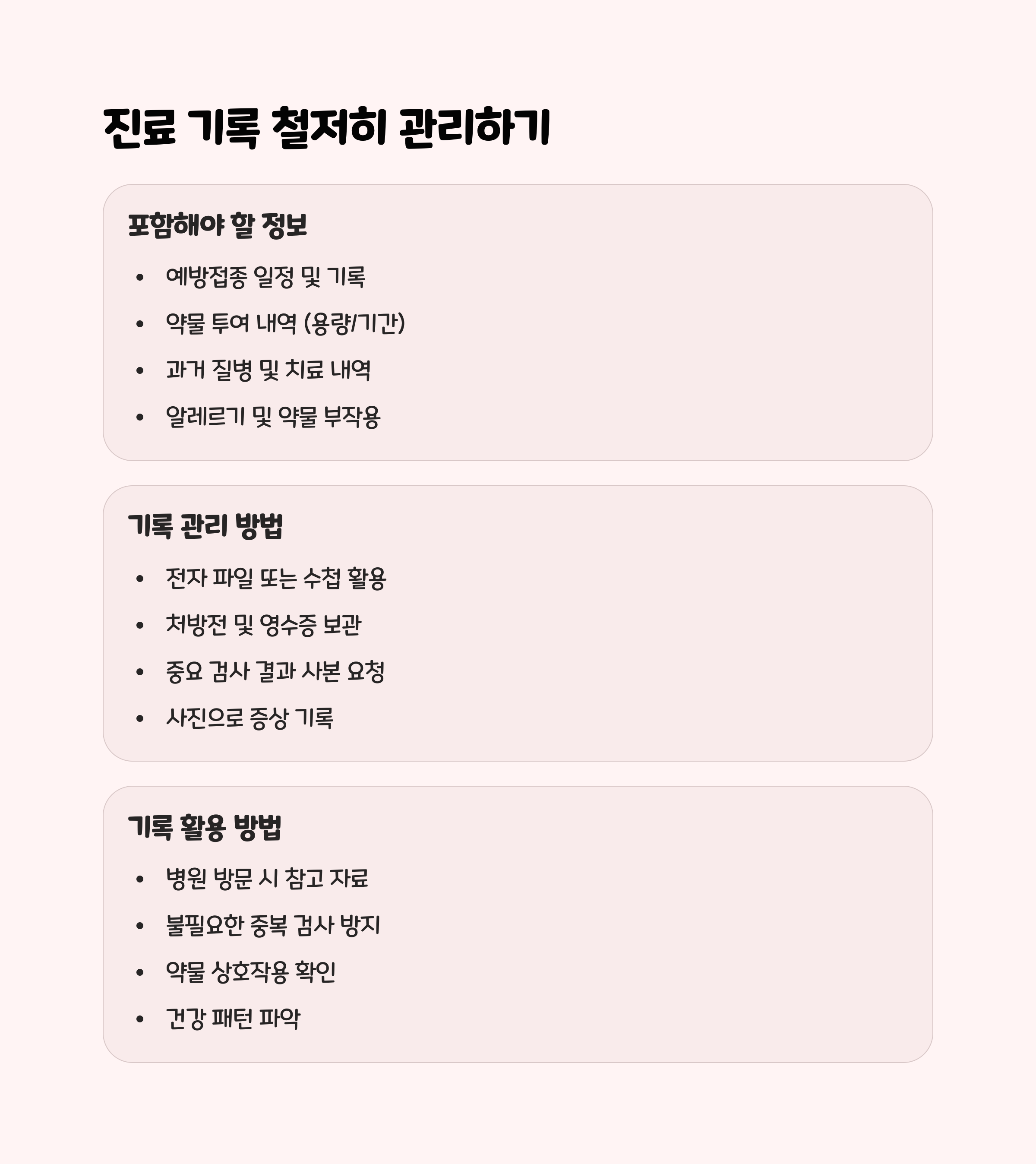 - 진료 기록 관리 : 병원에서 받은 진료 기록을 꼼꼼히 보관하면 불필요한 검사를 줄이고 비용을 절감할 수 있습니다.