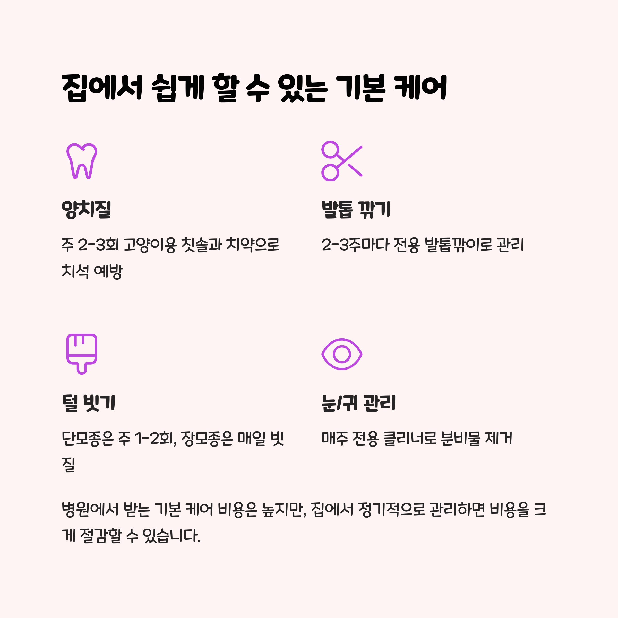실천 팁 : 매일 양치질을 시도하고, 주기적으로 발톱과 털 관리를 해주세요.