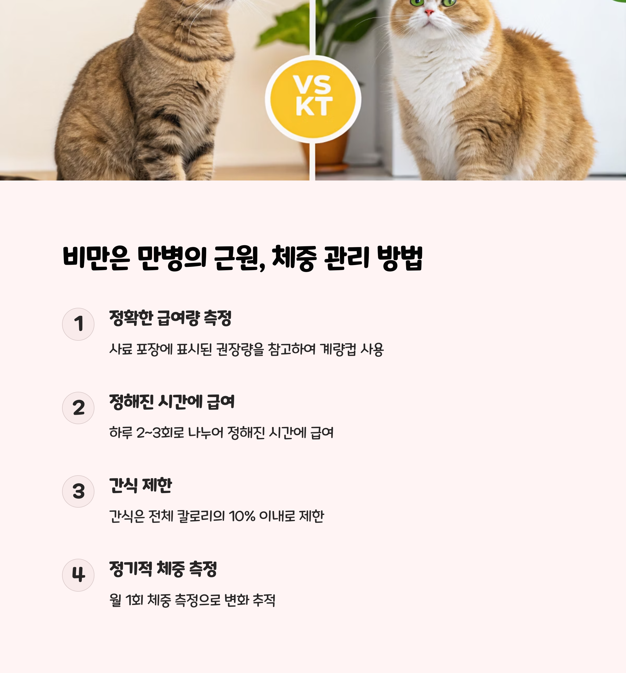 실천 팁 : 매주 고양이의 체중을 재고 기록하세요. 비만이나 체중 감소는 모두 질병으로 이어질 수 있으니 적절한 식단과 운동을 병행하세요.