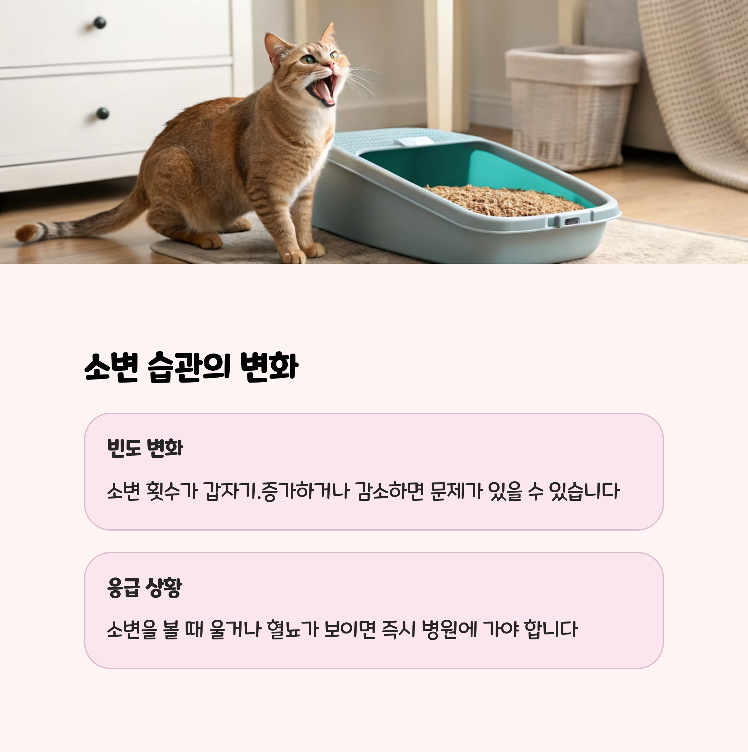 화장실을 자주 들락거리지만 소변을 거의 보지 못하거나, 소변을 볼 때 울음소리를 내거나, 평소와 달리 화장실이 아닌 곳에 실수를 한다면 하부요로질환, 요도폐색, 방광염 등 생명을 위협하는 응급 상황일 수 있습니다. 24시간 이상 소변을 보지 못하거나, 소변에 피가 섞여 있다면 즉시 응급실을 찾아야 합니다.