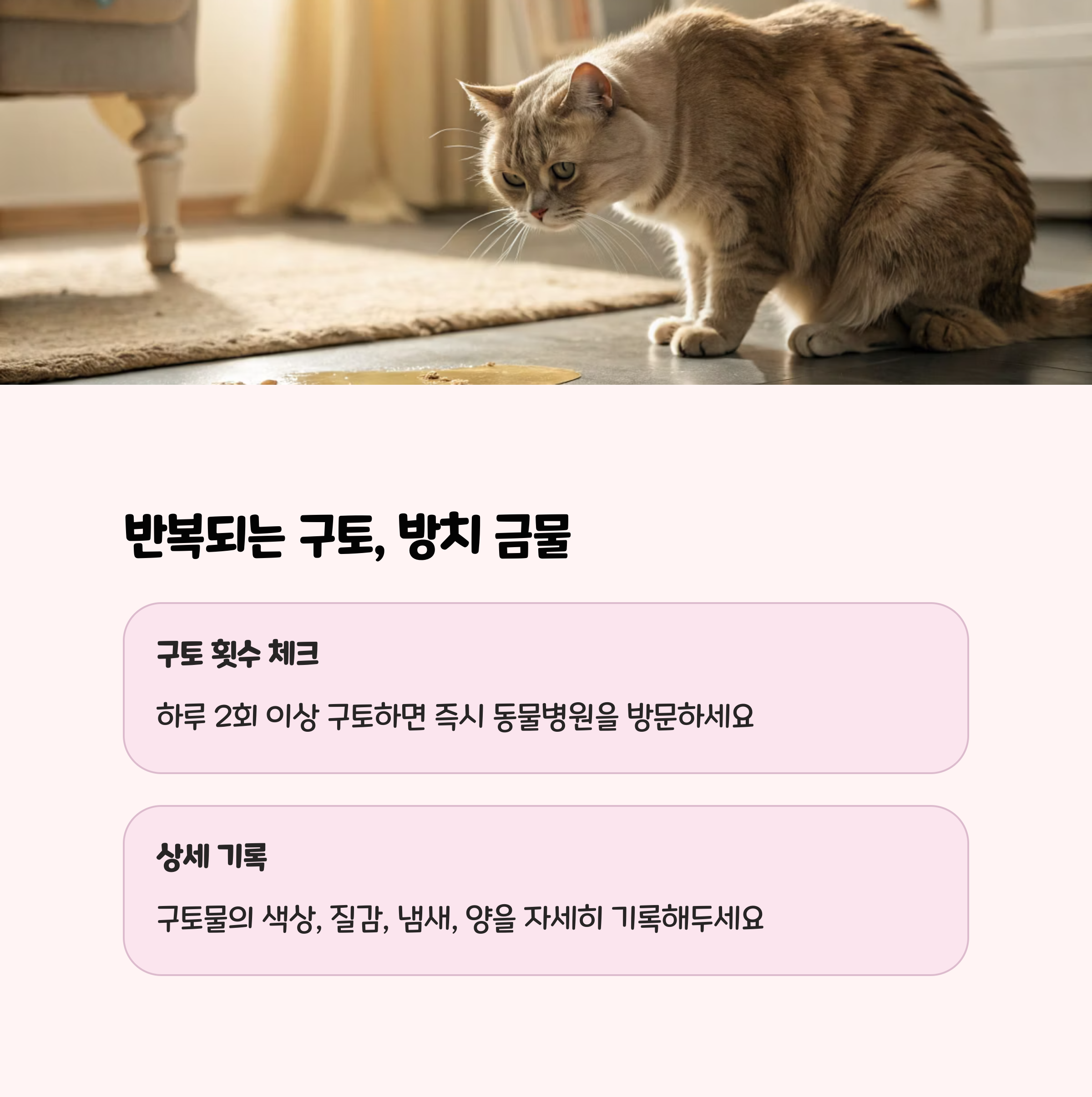응급진료가 가능한 병원의 위치와 연락처를 미리 메모해 두고, 평소 고양이의 식사, 배변, 행동 패턴을 꼼꼼히 기록해 두면 응급 상황 시 큰 도움이 됩니다.