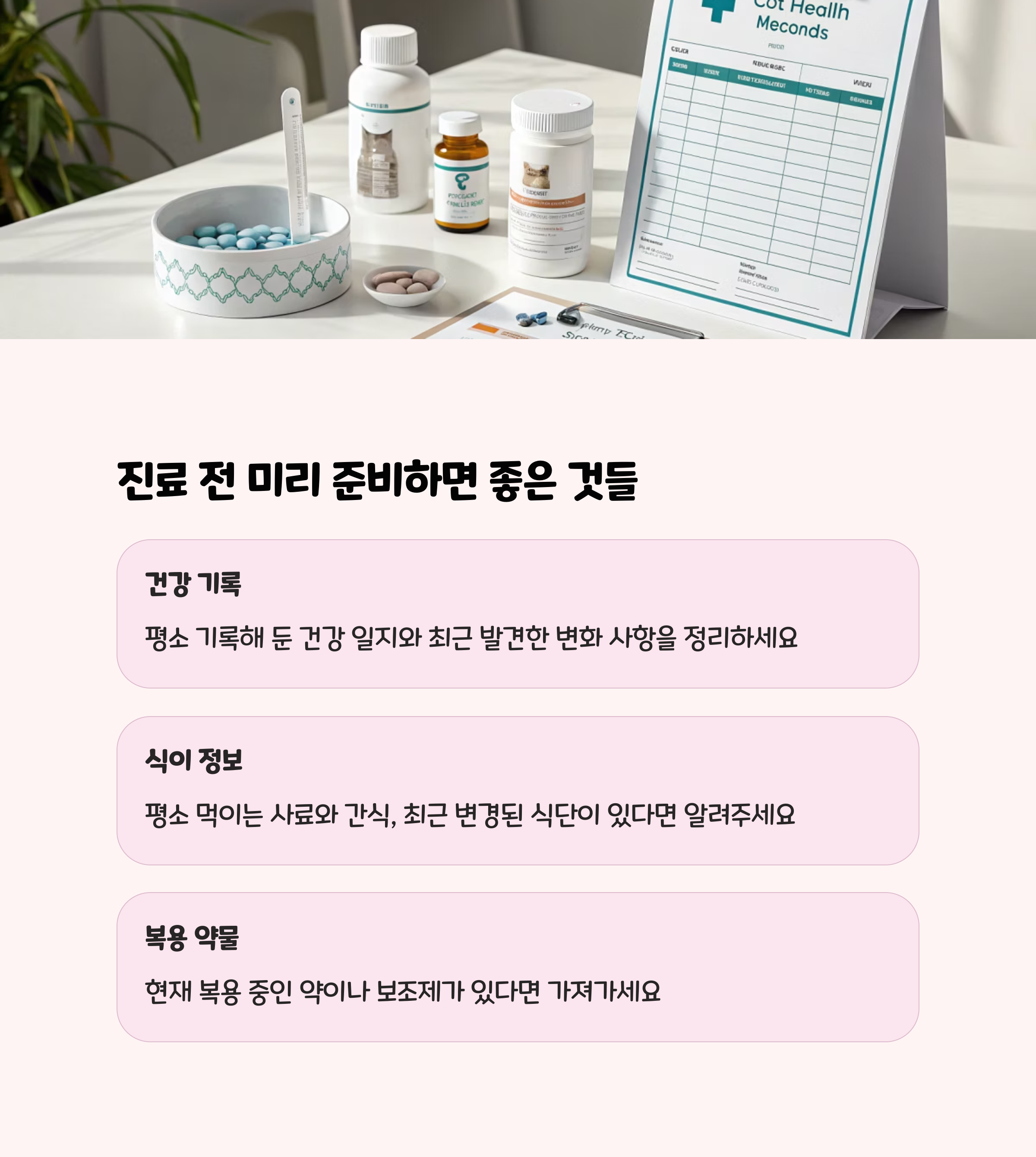 최근 식사량, 배변 횟수, 이상 행동, 증상 발생 시점, 복용 중인 약, 예방접종 이력 등을 메모해가면 수의사가 정확한 진단을 내리는데 큰 도움이 됩니다. 사진이나 영상도 함께 보여주면 좋습니다.