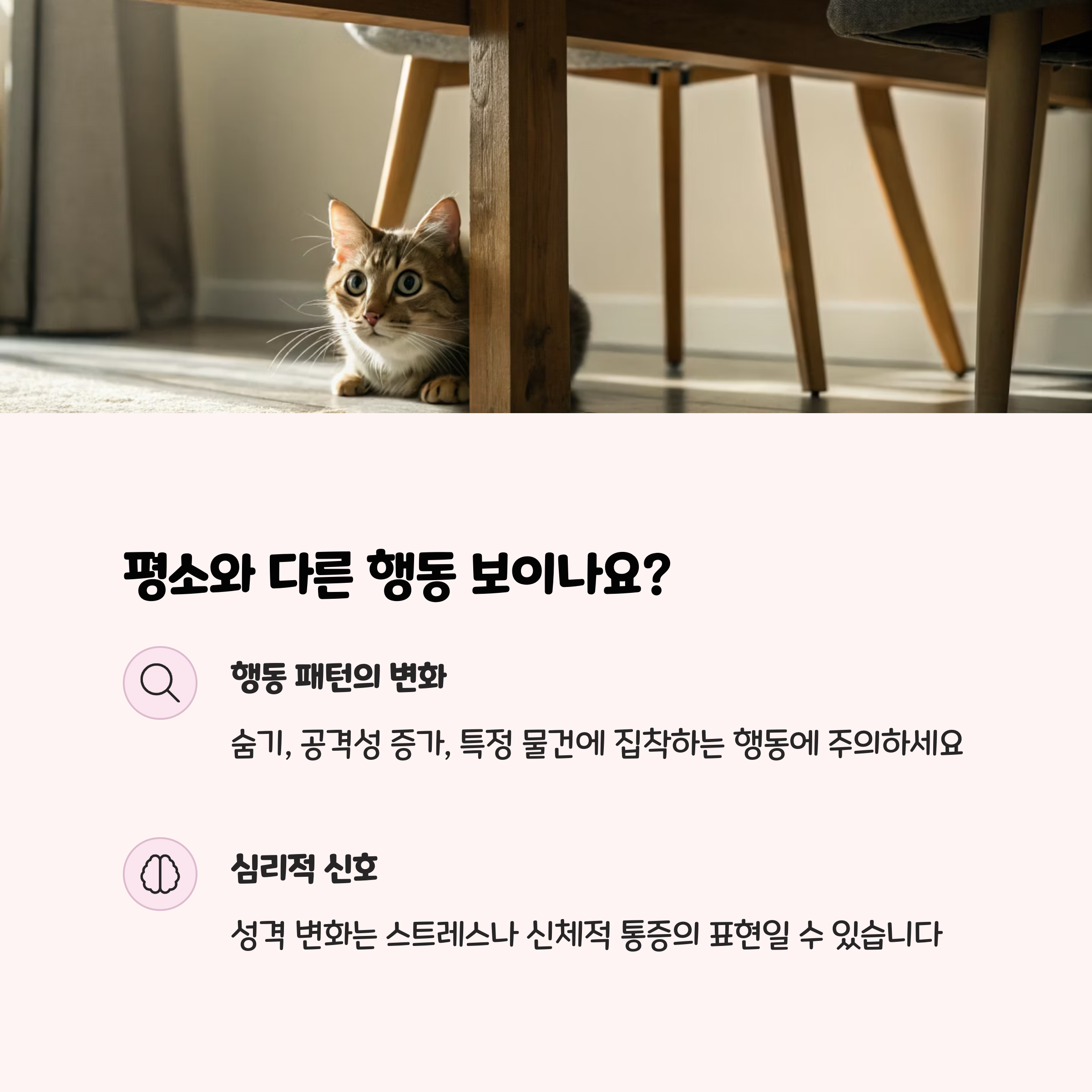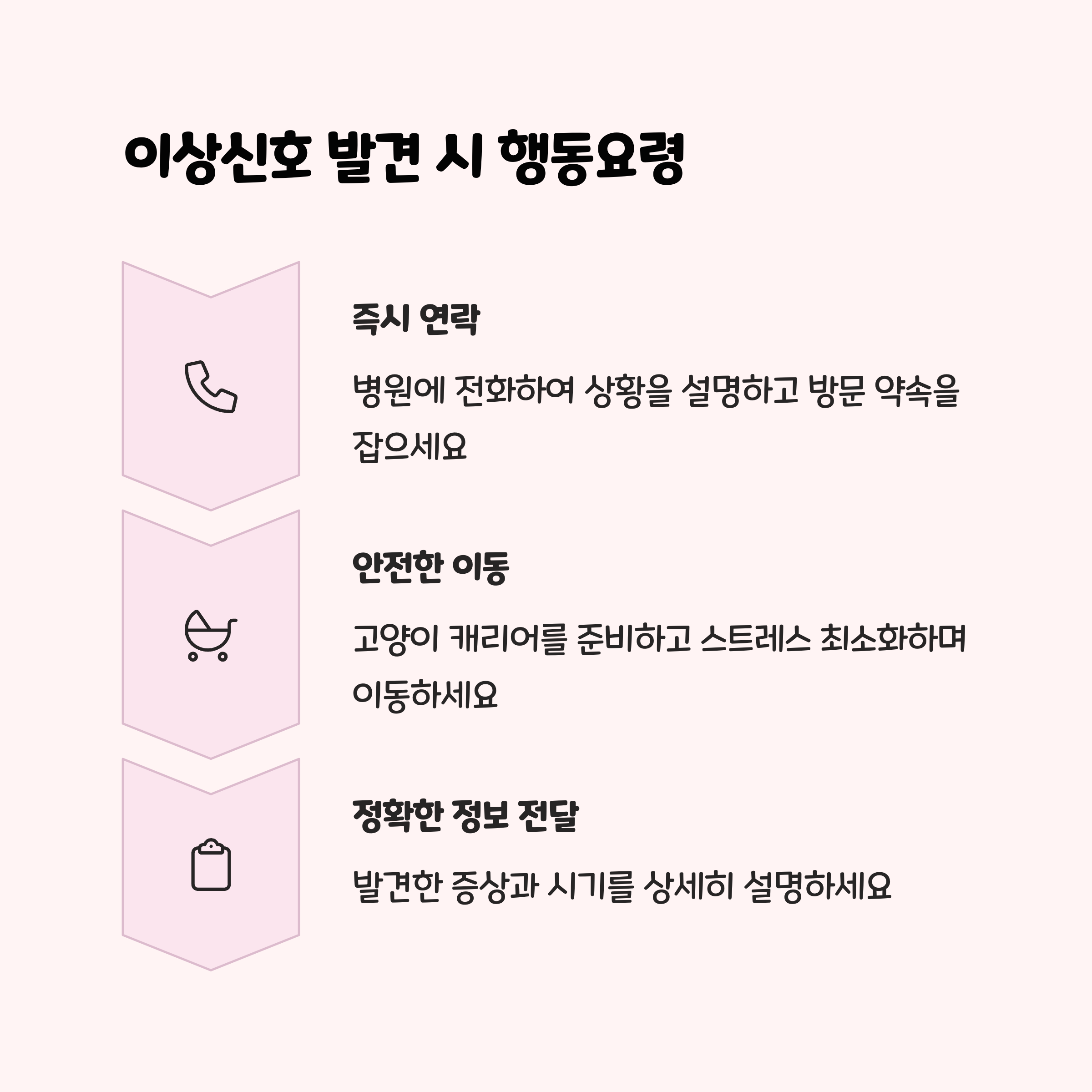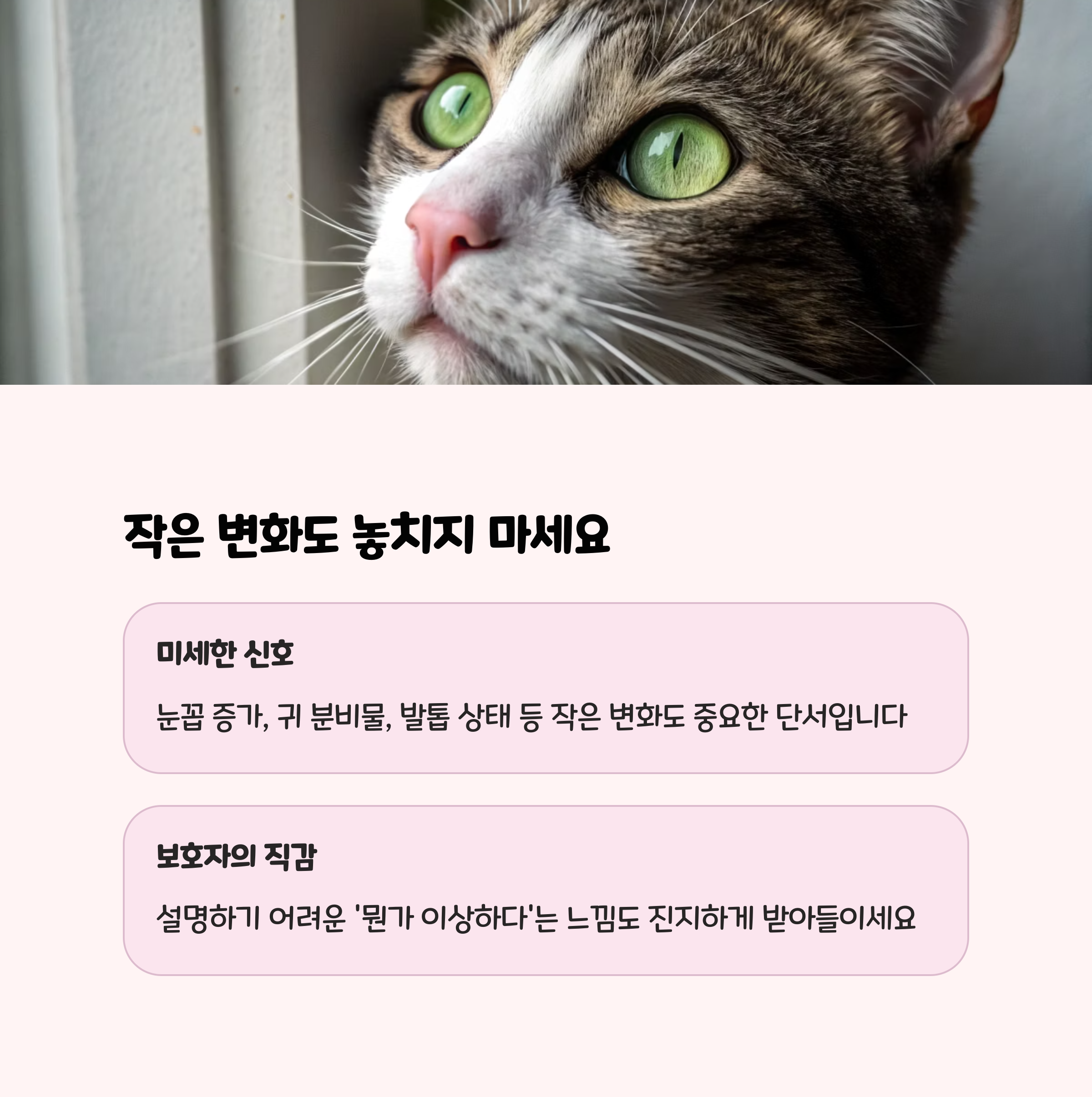 고양이는 아픈 티를 잘 내지 않는 동물입니다. 보호자의 세심한 관찰과 빠른 판단이 고양이의 생명을 지키는 가장 큰 힘이 됩니다. 위에서 소개한 대표 증상 외에도, 평소와 다른 행동이나 신체 변화를 발견했다면 “이 정도는 괜찮겠지”라는 생각보다, “혹시 모를 위험에 대비하자”는 마음으로 병원을 방문하는 것이 안전합니다.