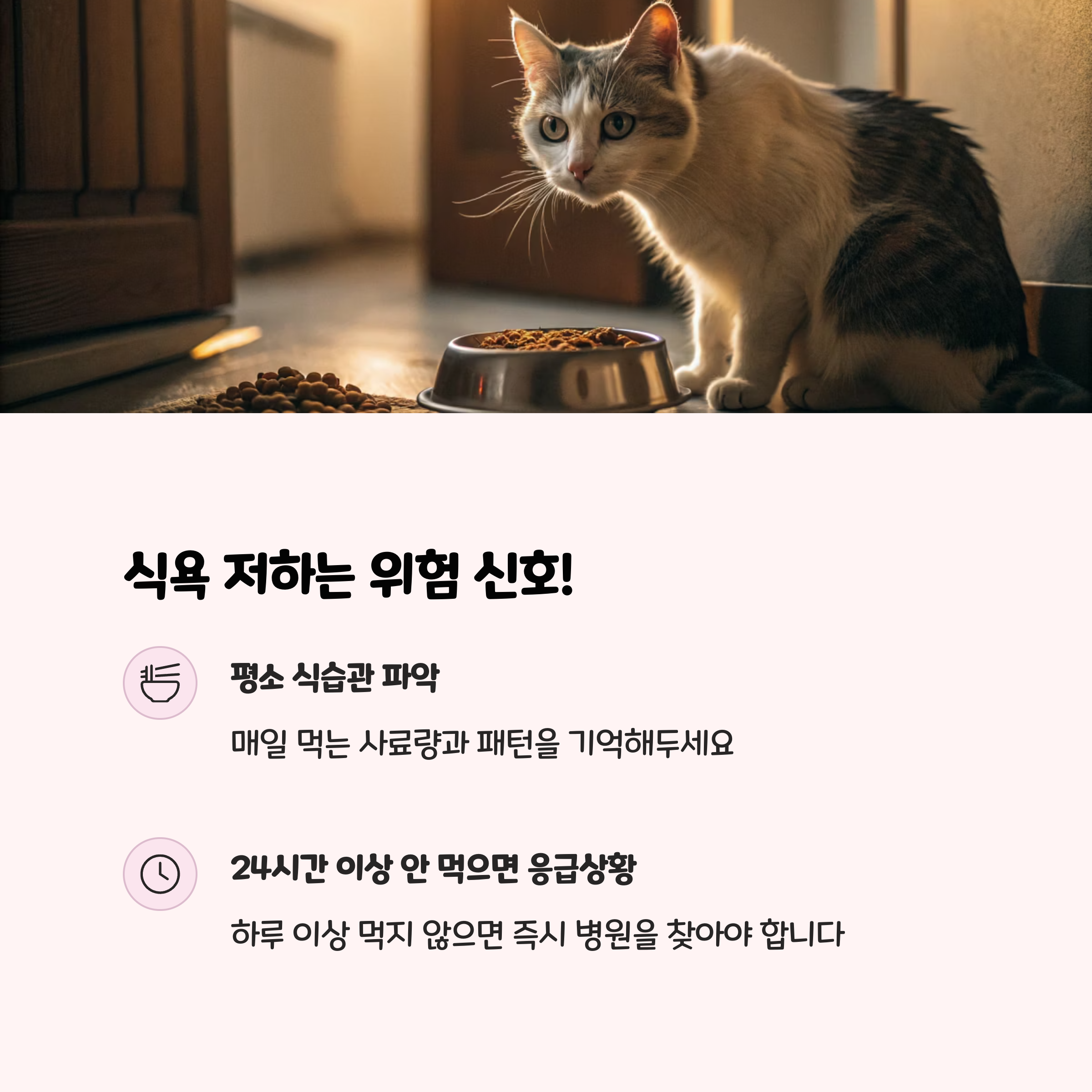 고양이는 24시간 이상 식사를 거르면 지방간 등 심각한 질환이 빠르게 진행될 수 있습니다. 특히 비만묘나 노령묘는 위험이 더 높으니, 하루 이상 식욕이 없으면 즉시 동물병원에서 진료를 받아야 합니다.