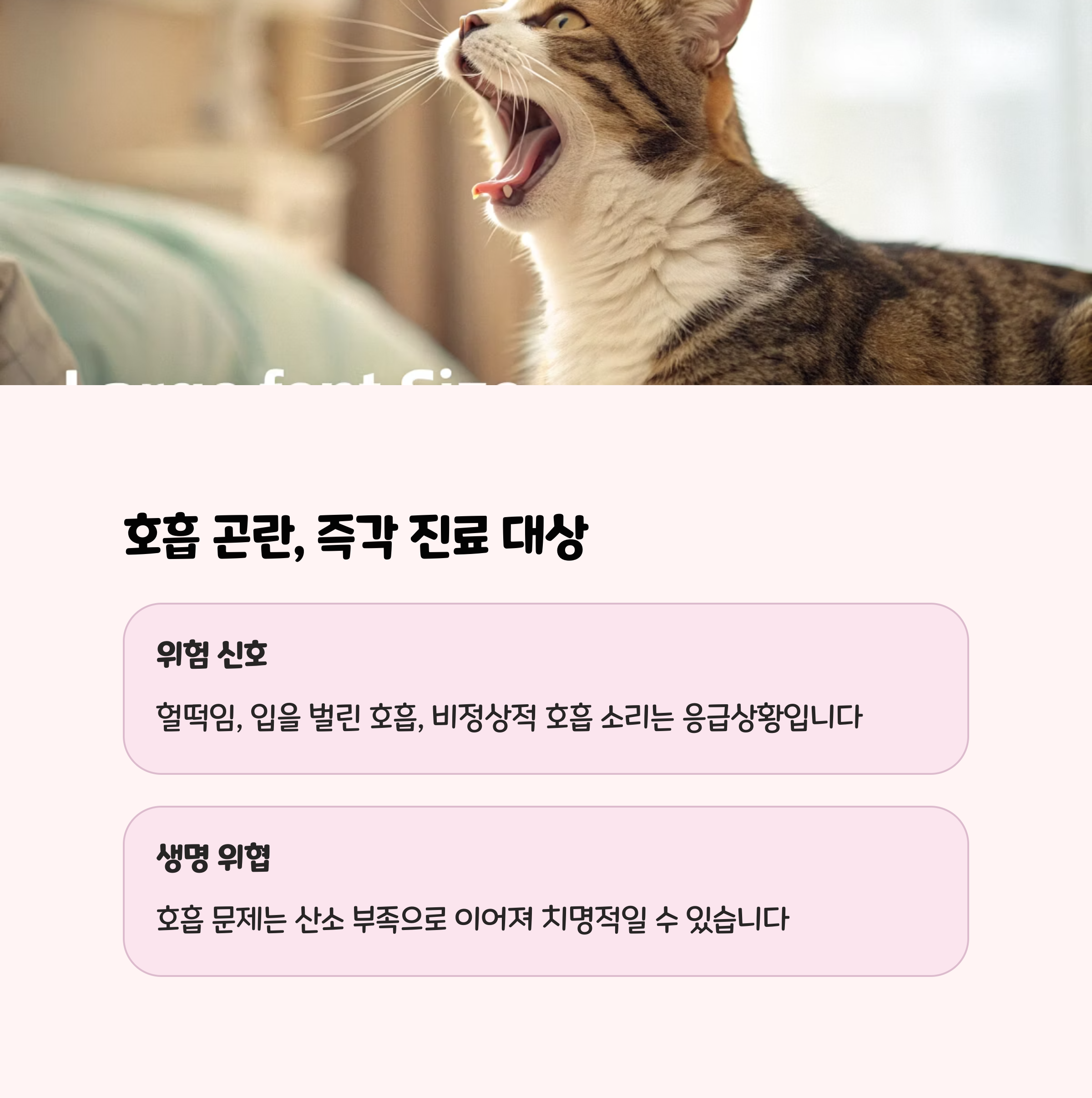 고양이가 숨을 헐떡거리거나, 얕고 빠른 호흡을 하거나, 입을 벌리고 숨을 쉬는 모습을 보인다면 심장질환, 폐수종, 천식 등 심각한 호흡기 질환일 수 있습니다. 이런 증상은 빠르게 악화될 수 있으므로, 즉시 산소 처치가 가능한 동물병원을 방문해야 합니다.