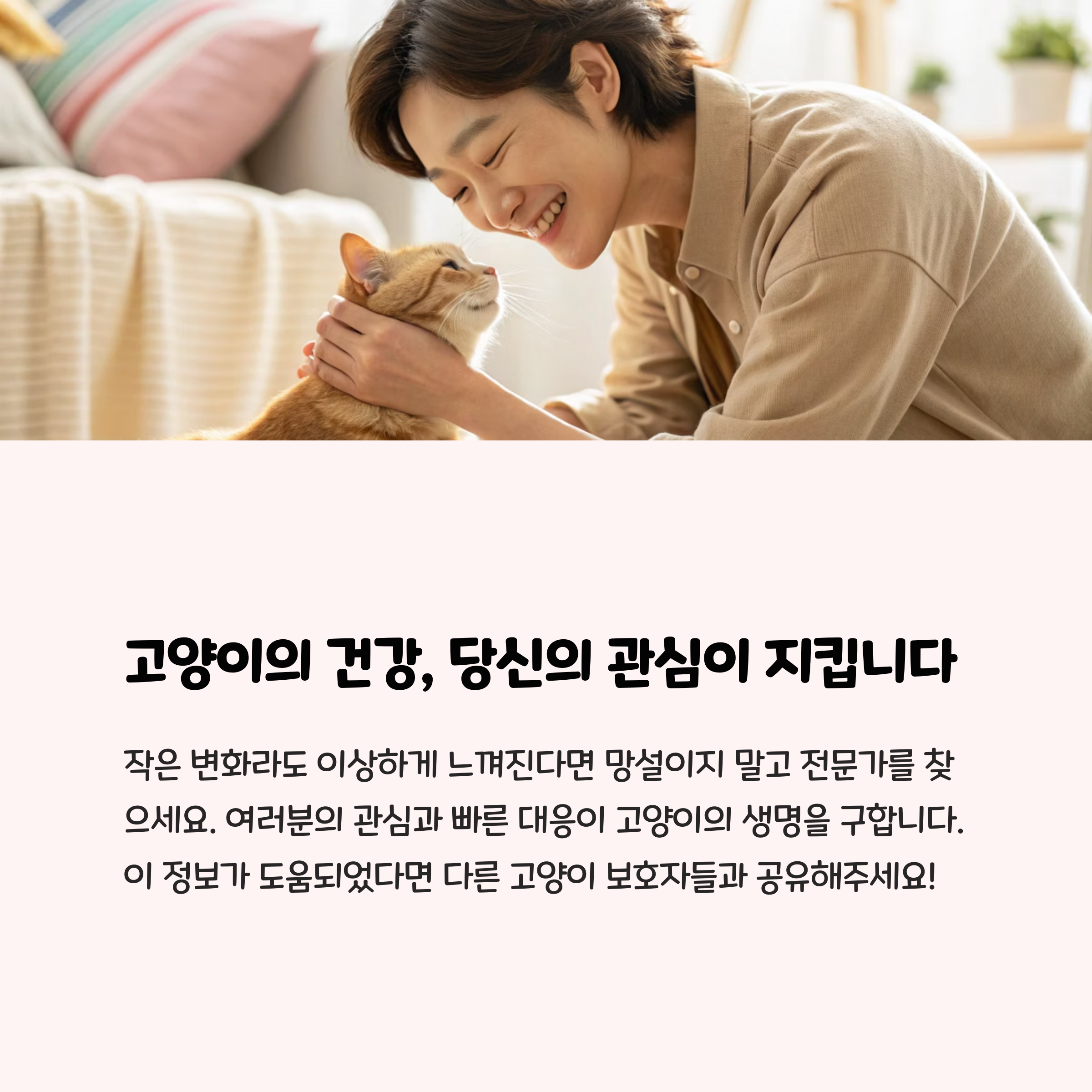 고양이는 아픈 티를 잘 내지 않는 동물입니다. 보호자의 세심한 관찰과 빠른 판단이 고양이의 생명을 지키는 가장 큰 힘이 됩니다. 위에서 소개한 대표 증상 외에도, 평소와 다른 행동이나 신체 변화를 발견했다면 “이 정도는 괜찮겠지”라는 생각보다, “혹시 모를 위험에 대비하자”는 마음으로 병원을 방문하는 것이 안전합니다.