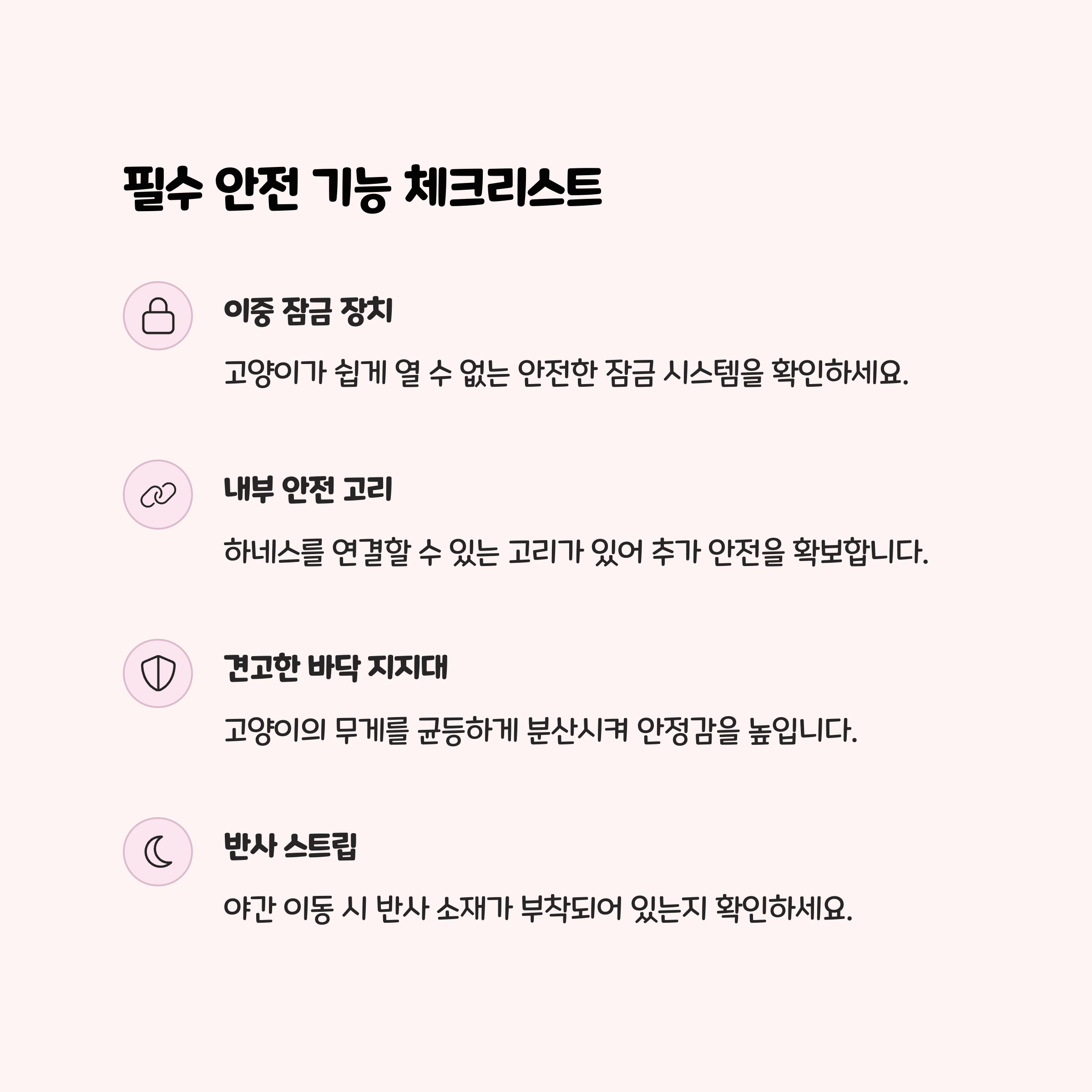 - 이중 잠금장치 : 고양이 힘으로는 열 수 없는 안전 지퍼, 스냅단추 등 필수.