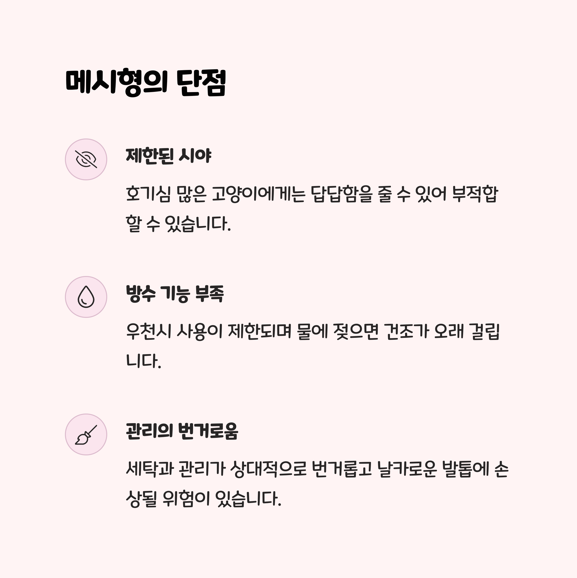 - 시야 제한 : 고양이가 바깥을 완전히 볼 수 없어, 호기심 많은 아이는 답답해할 수 있습니다.