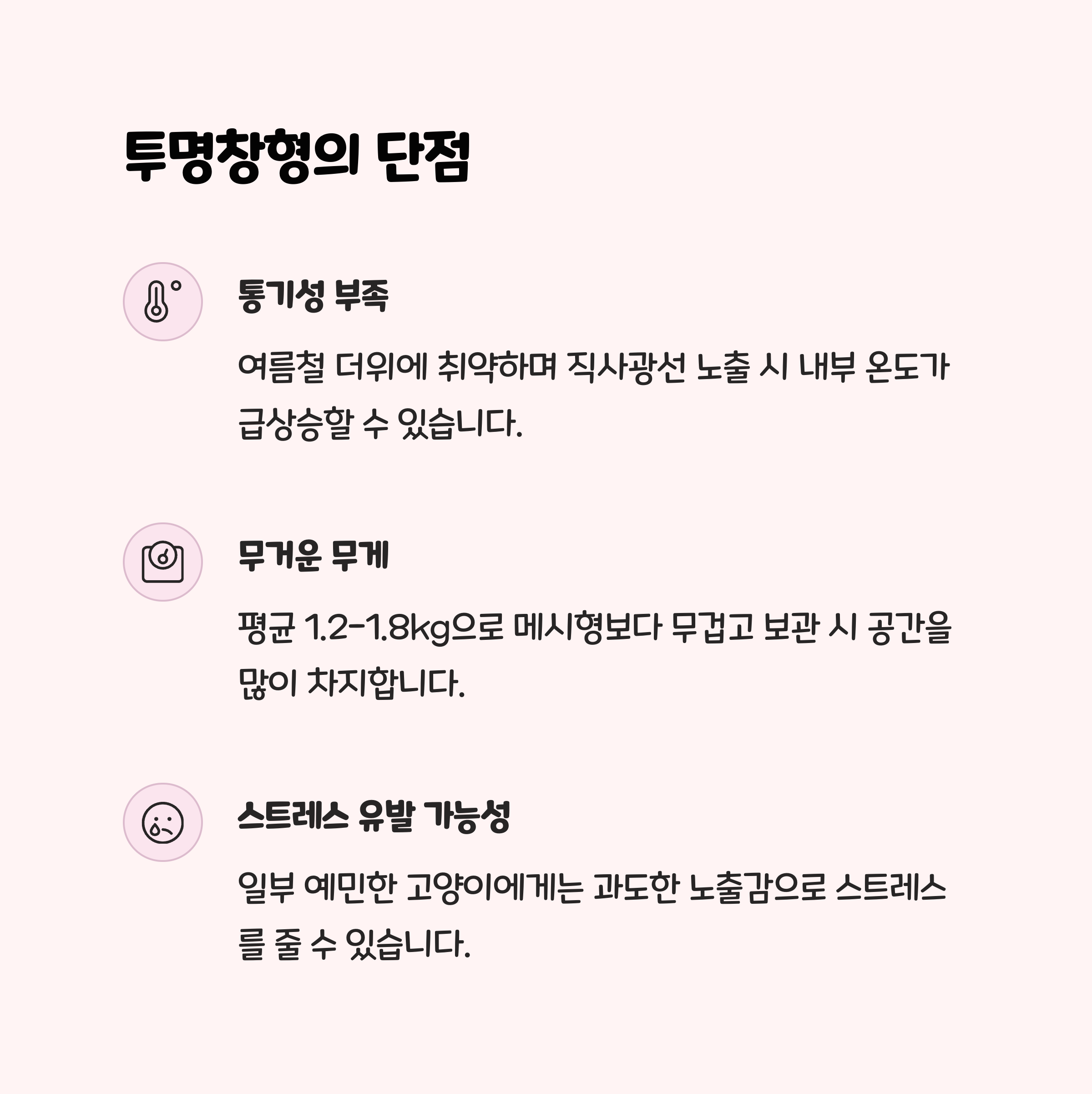 - 스트레스 유발 가능성 : 낯선 환경에 예민한 고양이의 경우, 외부 자극이 그대로 전달되어 불안해할 수 있습니다.