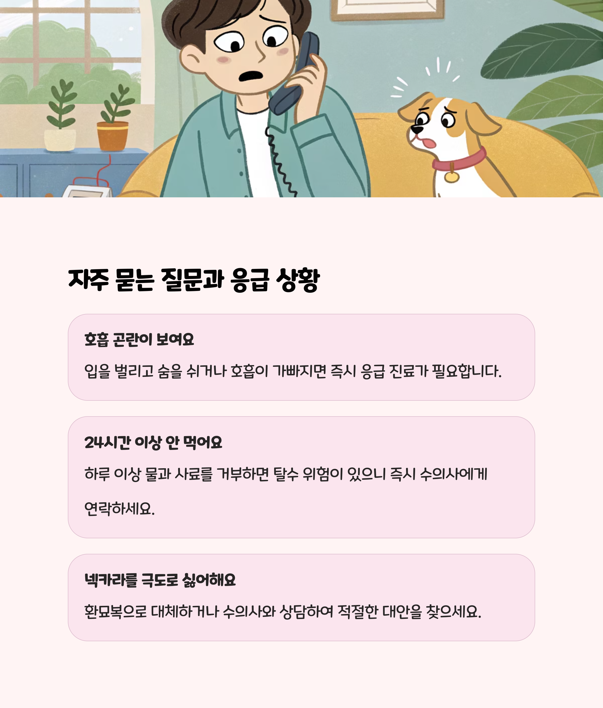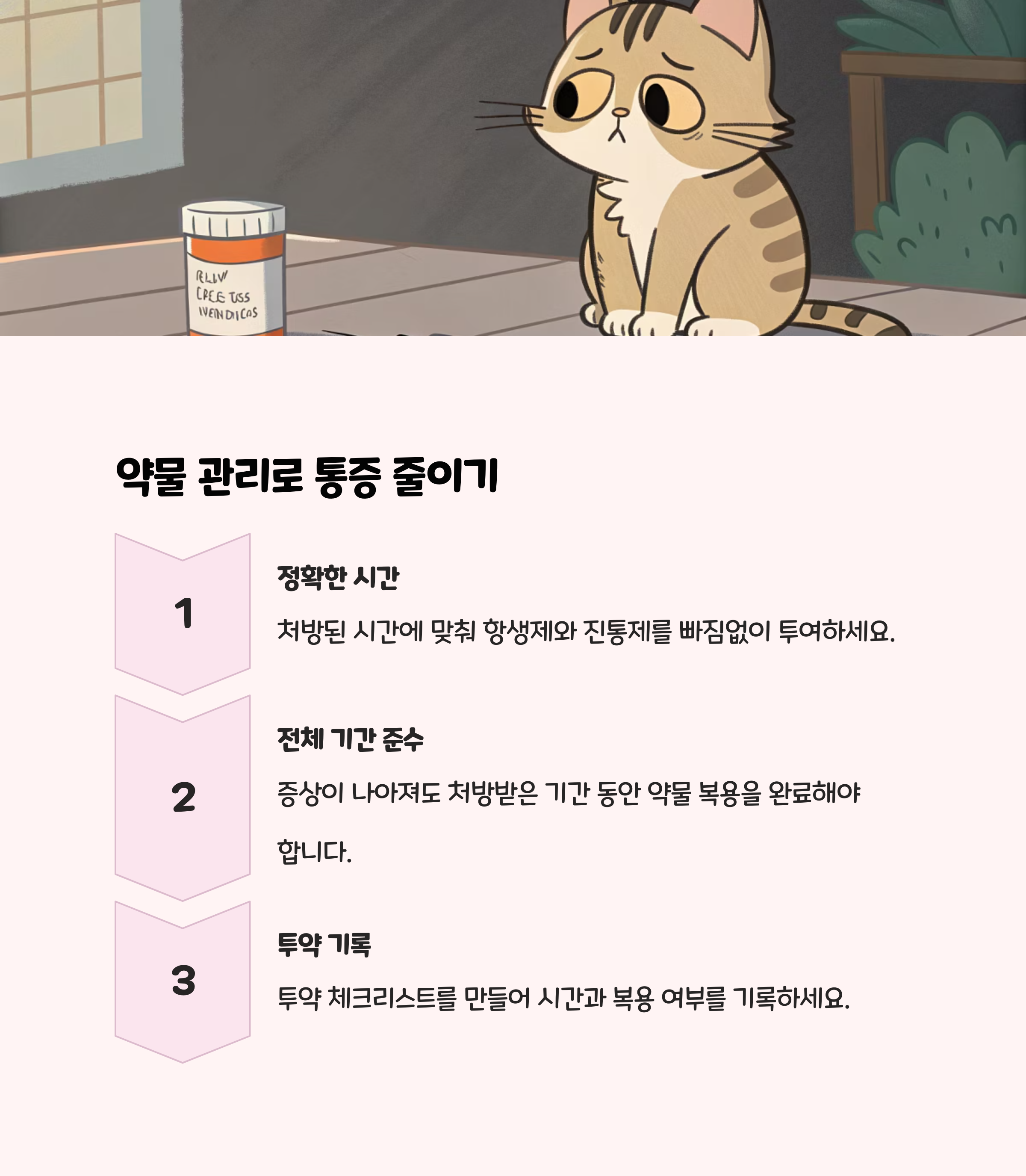 • 수의사와의 소통을 게을리하지 마세요. 작은 변화도 바로 문의하는 것이 안전합니다.