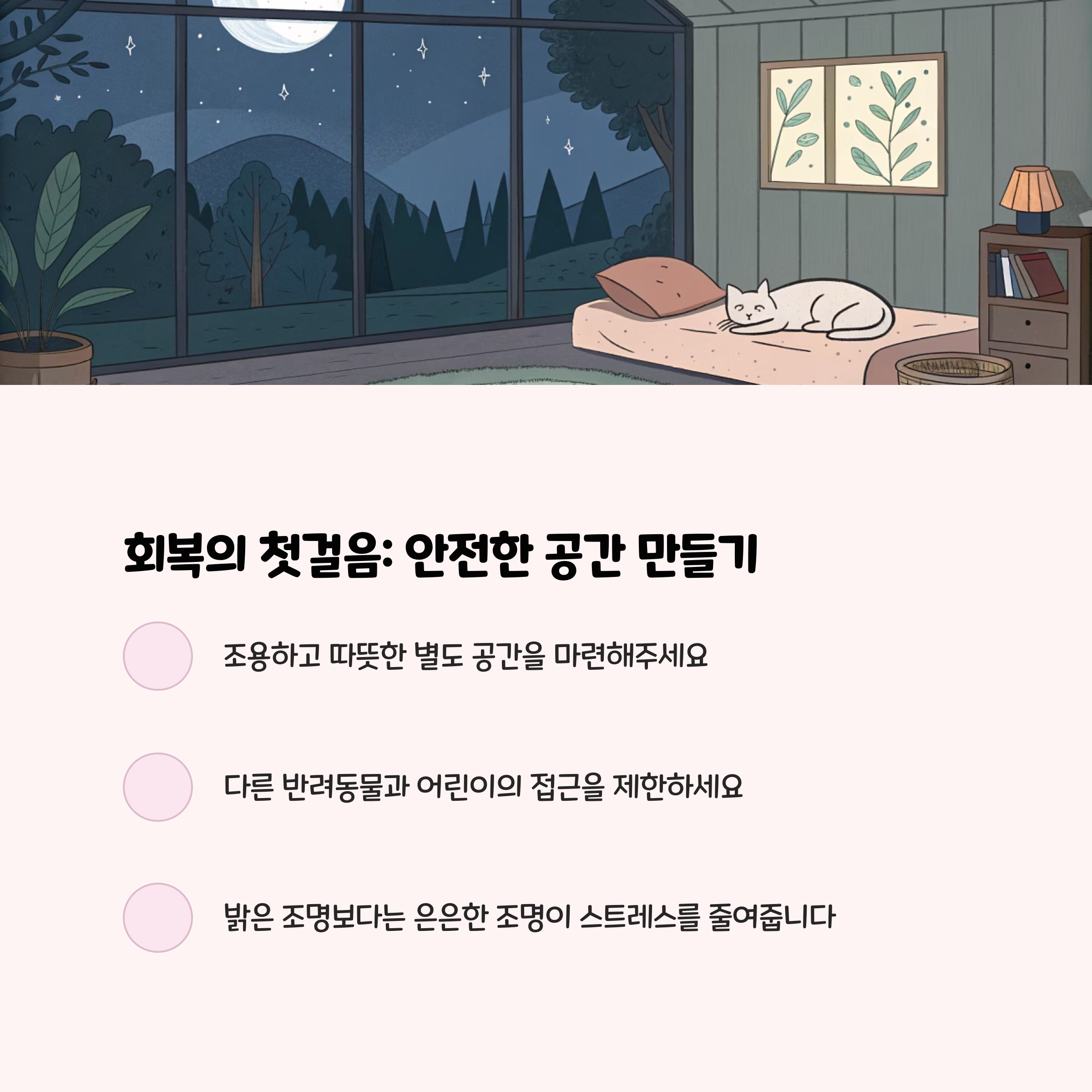 회복 기간 동안에는 고양이를 조용하고 안전한 공간에 격리하는 것이 좋습니다. 다른 동물과의 접촉을 최소화해 스트레스를 줄이고, 상처가 오염되는 것을 방지하세요.