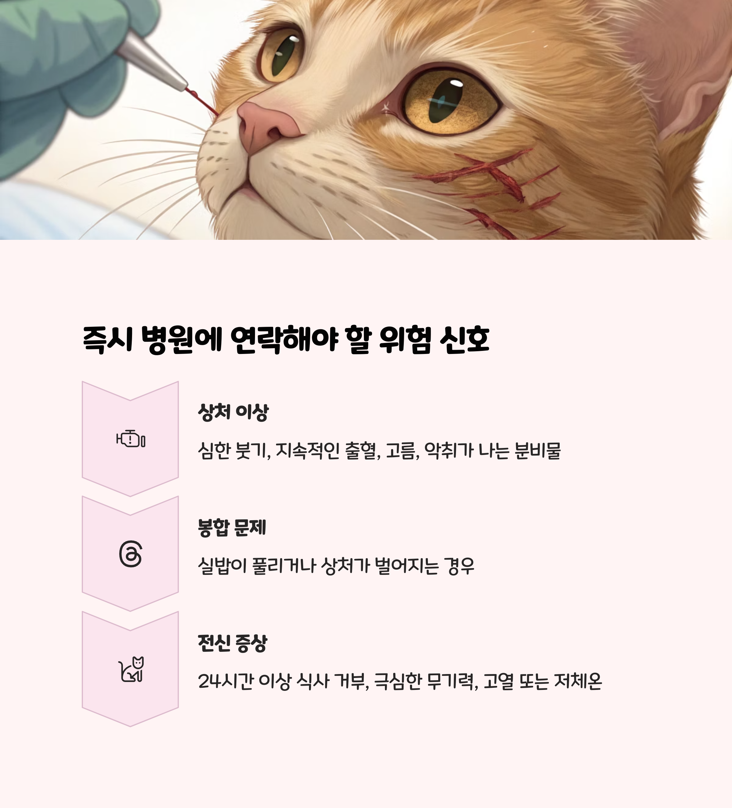 • 심한 붓기, 출혈, 고름, 상처 벌어짐: 즉시 동물병원 방문