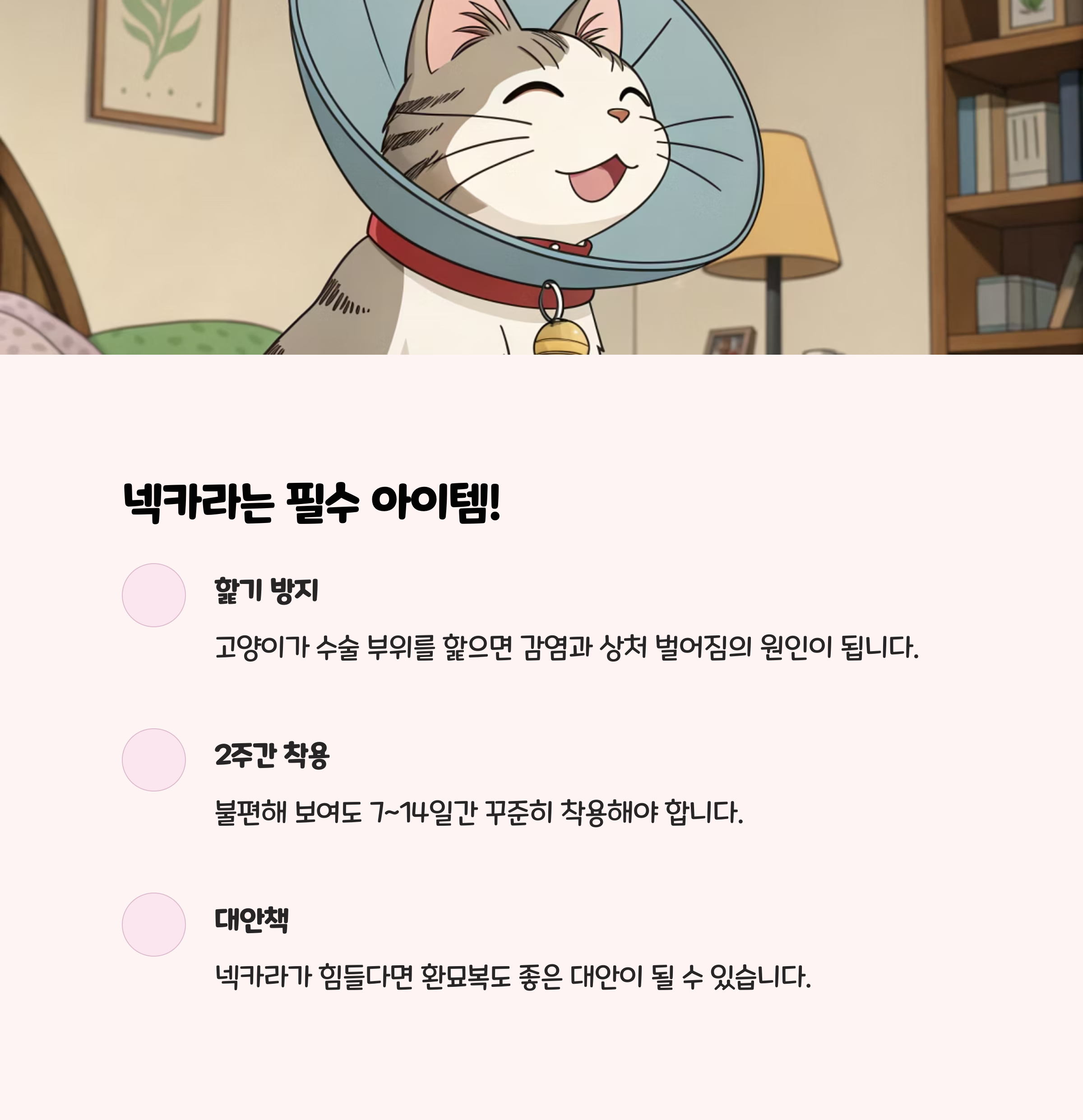 | 1~3일차 | 활동 최대한 제한, 상처 점검, 넥카라 착용 | 무기력, 식욕부진, 출혈 시 즉시 병원 방문 |
