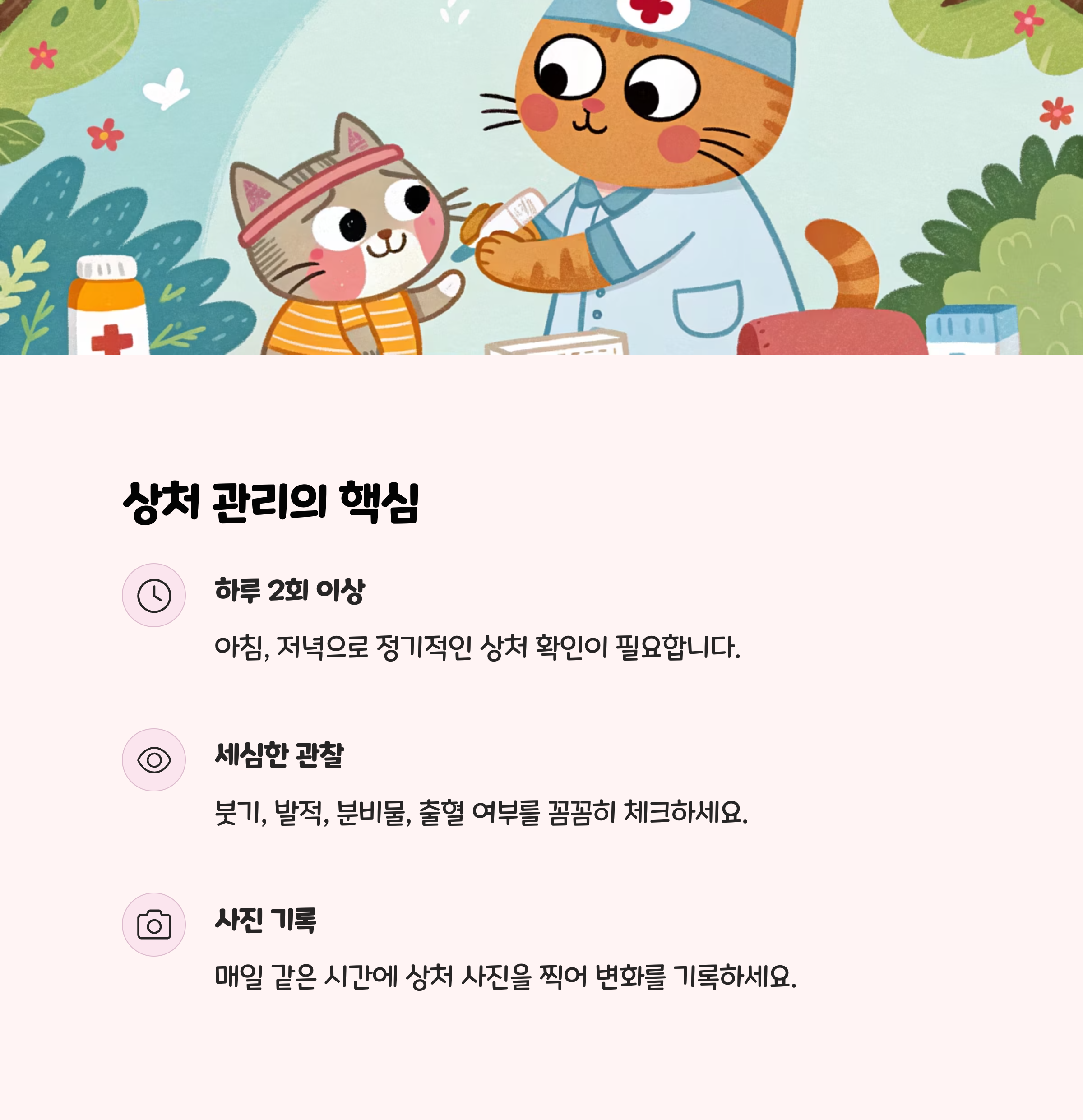 | 4~7일차 | 상처 부위 붓기/발적 감소 확인, 약 복용 | 상처 핥기/물기 방지, 활동 제한 유지 |