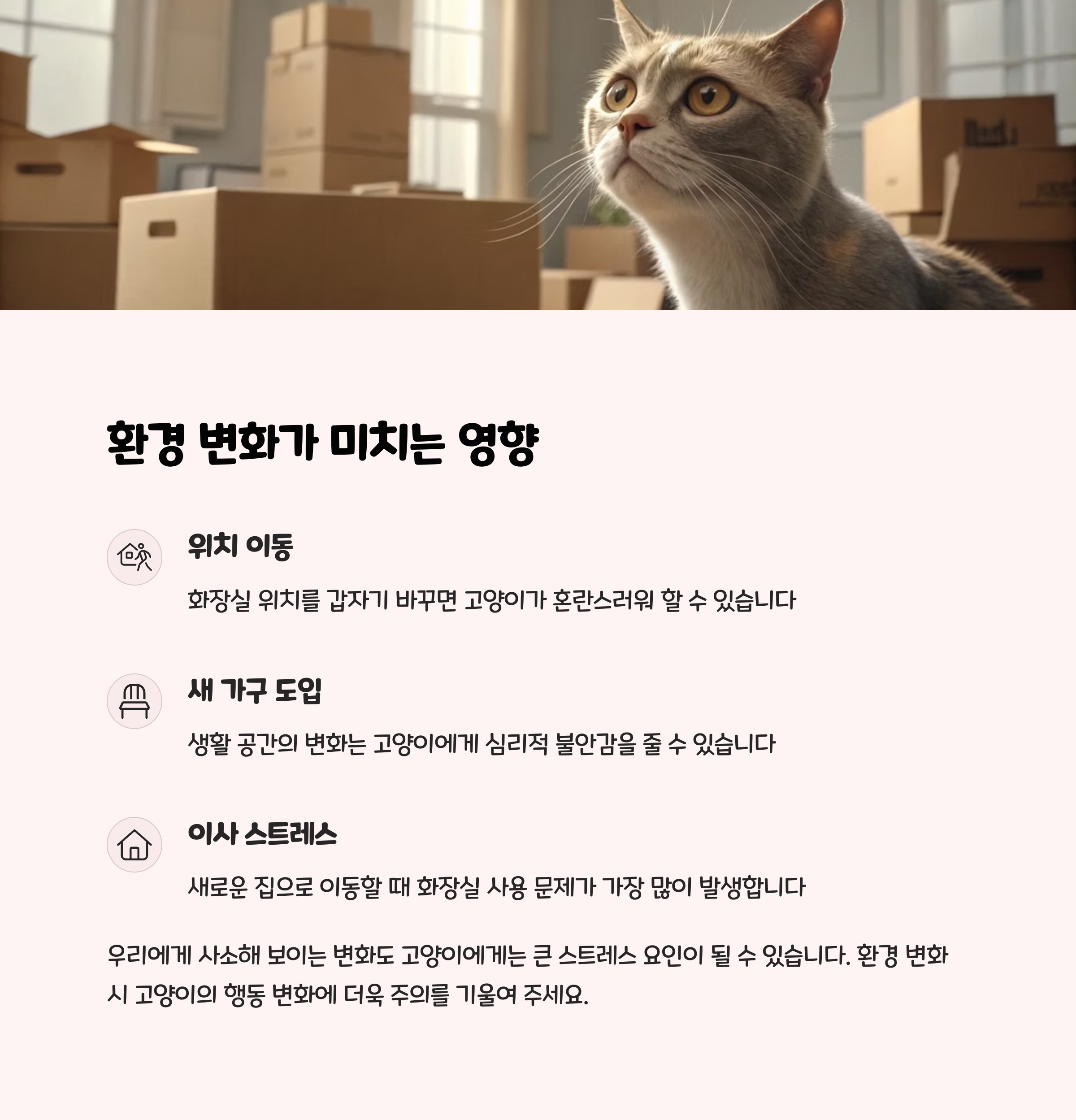 고양이의 화장실 문제는 단순히 행동 문제가 아니라 환경적 요인과 건강 상태가 복합적으로 작용하는 경우가 많습니다. 적절한 모래 선택과 쾌적한 환경 제공은 이러한 문제를 예방하고 해결하는 데 중요한 역할을 합니다. 집사님의 세심한 관찰과 배려가 고양이에게 안정감과 행복감을 줄 것입니다!