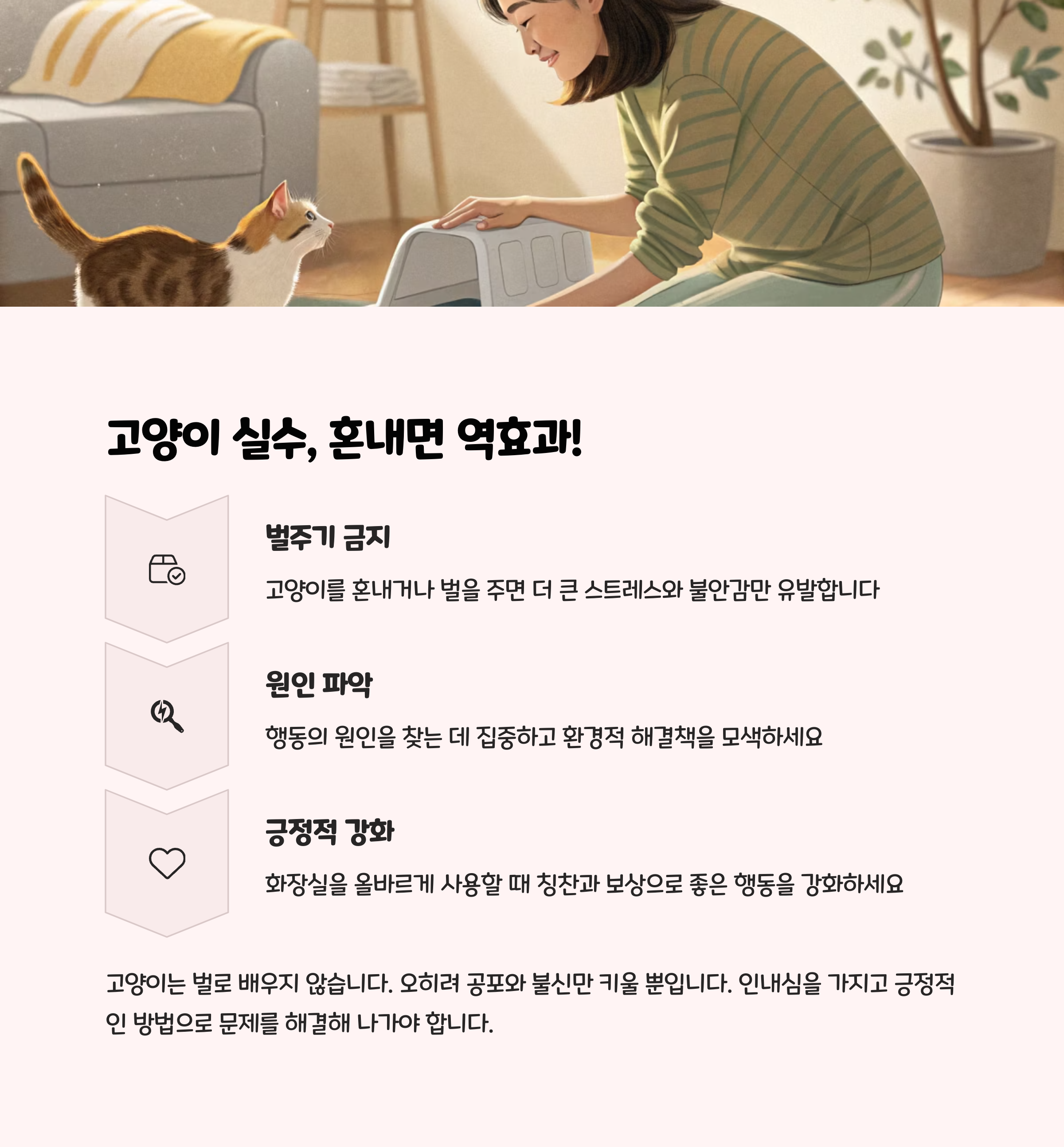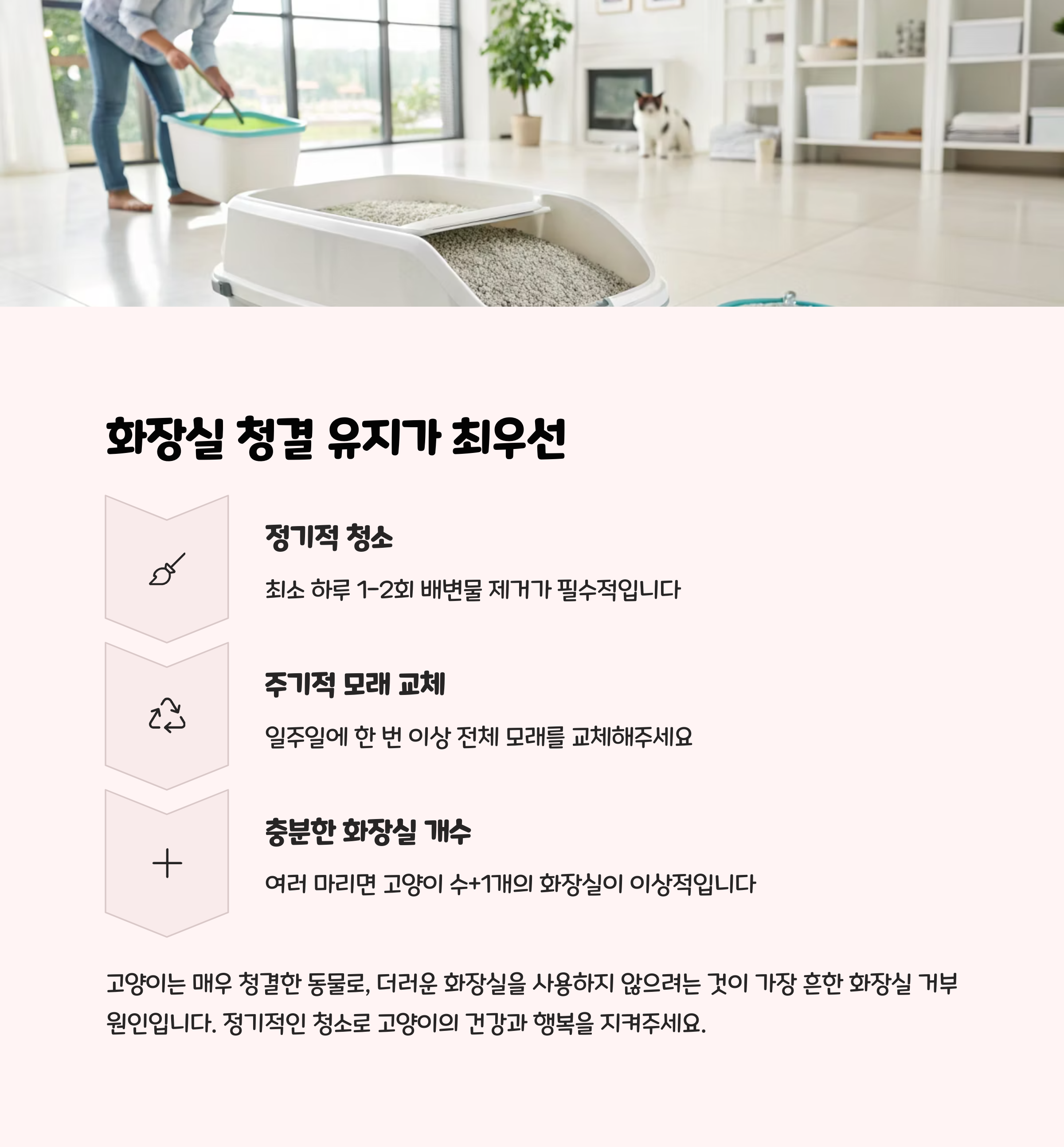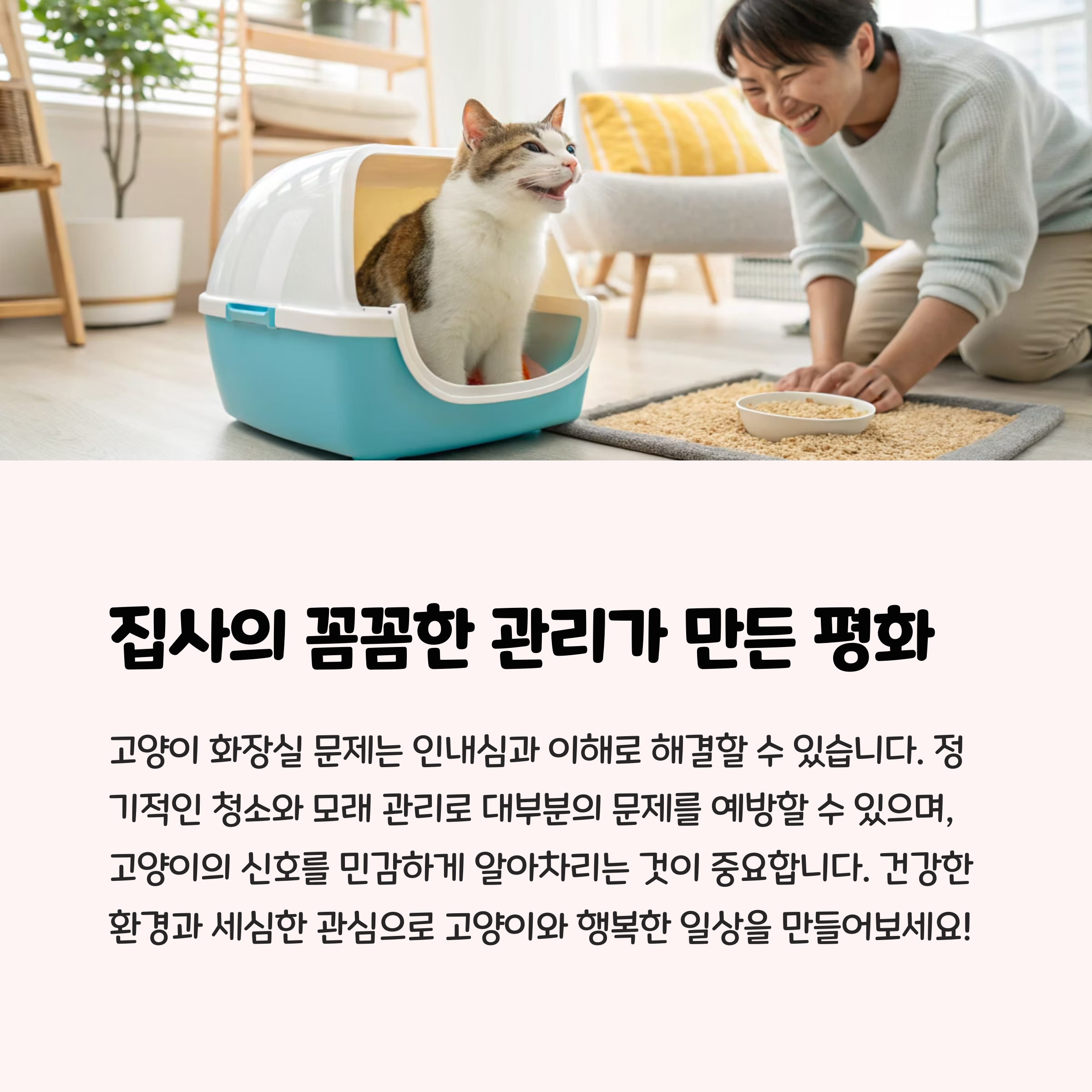 고양이의 화장실 문제는 단순히 행동 문제가 아니라 환경적 요인과 건강 상태가 복합적으로 작용하는 경우가 많습니다. 적절한 모래 선택과 쾌적한 환경 제공은 이러한 문제를 예방하고 해결하는 데 중요한 역할을 합니다. 집사님의 세심한 관찰과 배려가 고양이에게 안정감과 행복감을 줄 것입니다!