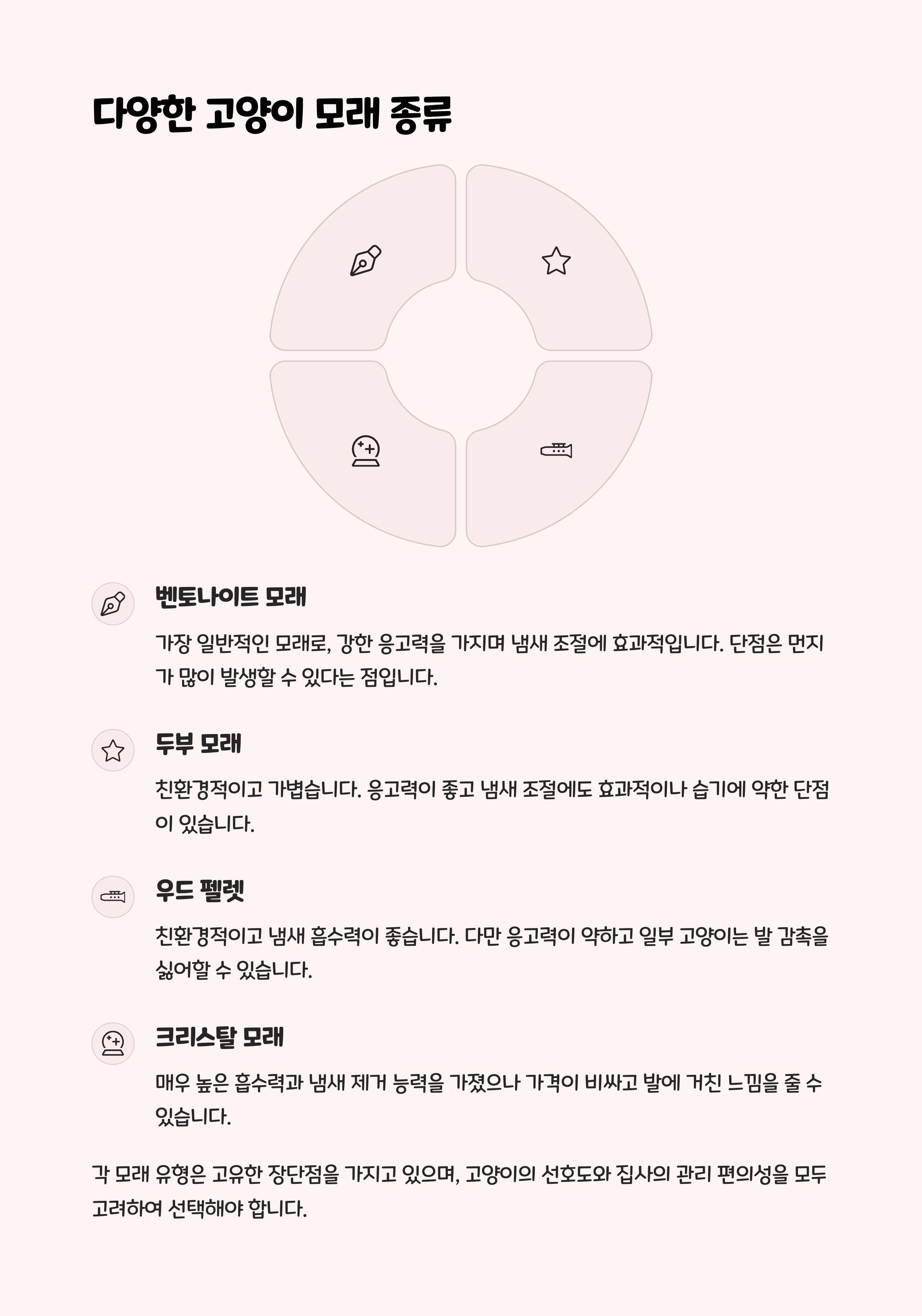 | 두부 모래 | 두부 부산물로 만든 친환경 모래 | 먼지 적음, 변기에 버릴 수 있음 | 응고력 약함, 여름철 곰팡이 발생 가능 |