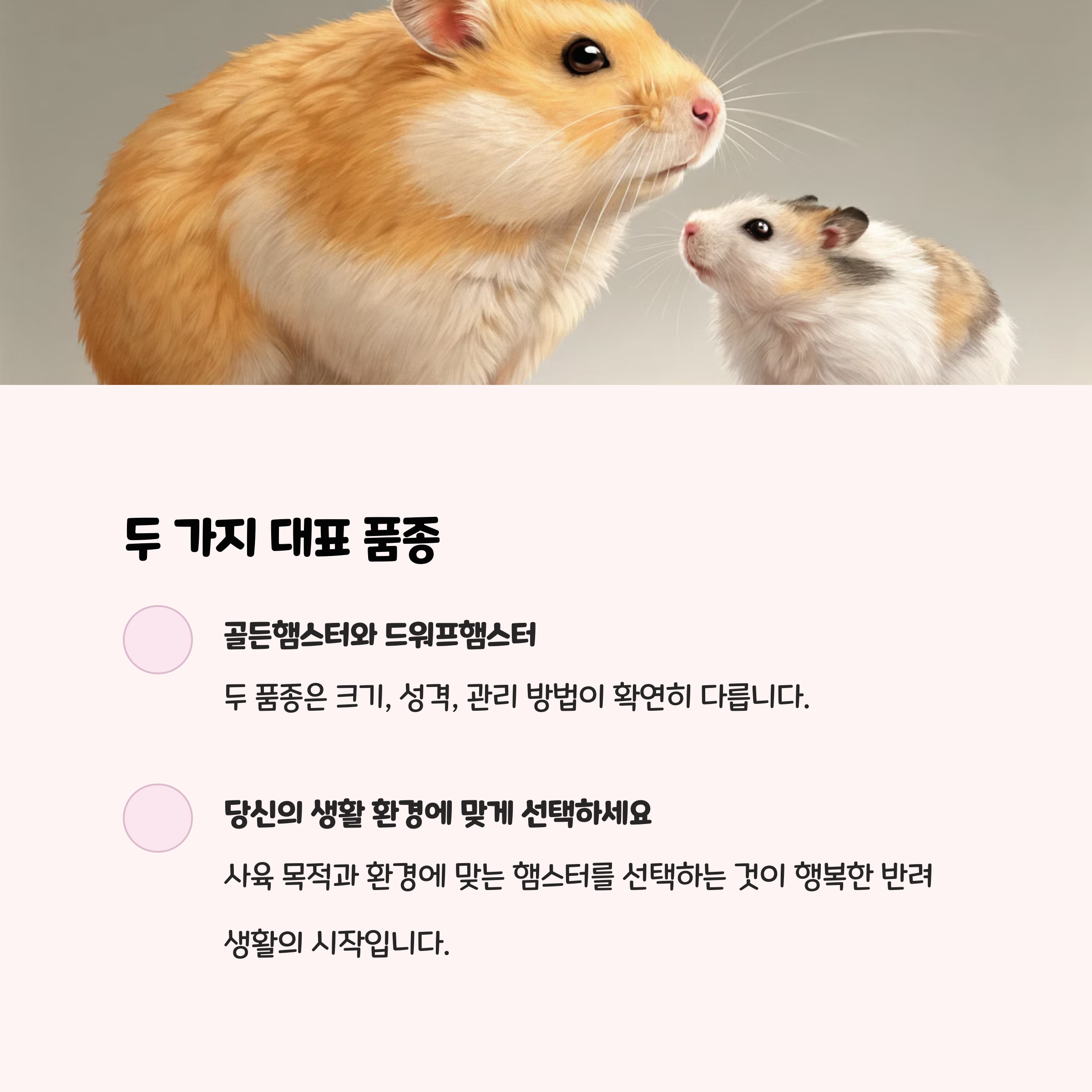 햄스터를 입양하기 전에는 단순히 '귀엽다'는 이유만으로 결정하기보다는, 생활환경, 가족 구성, 관리 가능성, 그리고 본인의 취향까지 꼼꼼히 따져보는 것이 중요합니다. 두 품종의 차이를 명확히 이해하면, 후회 없는 선택이 가능합니다.