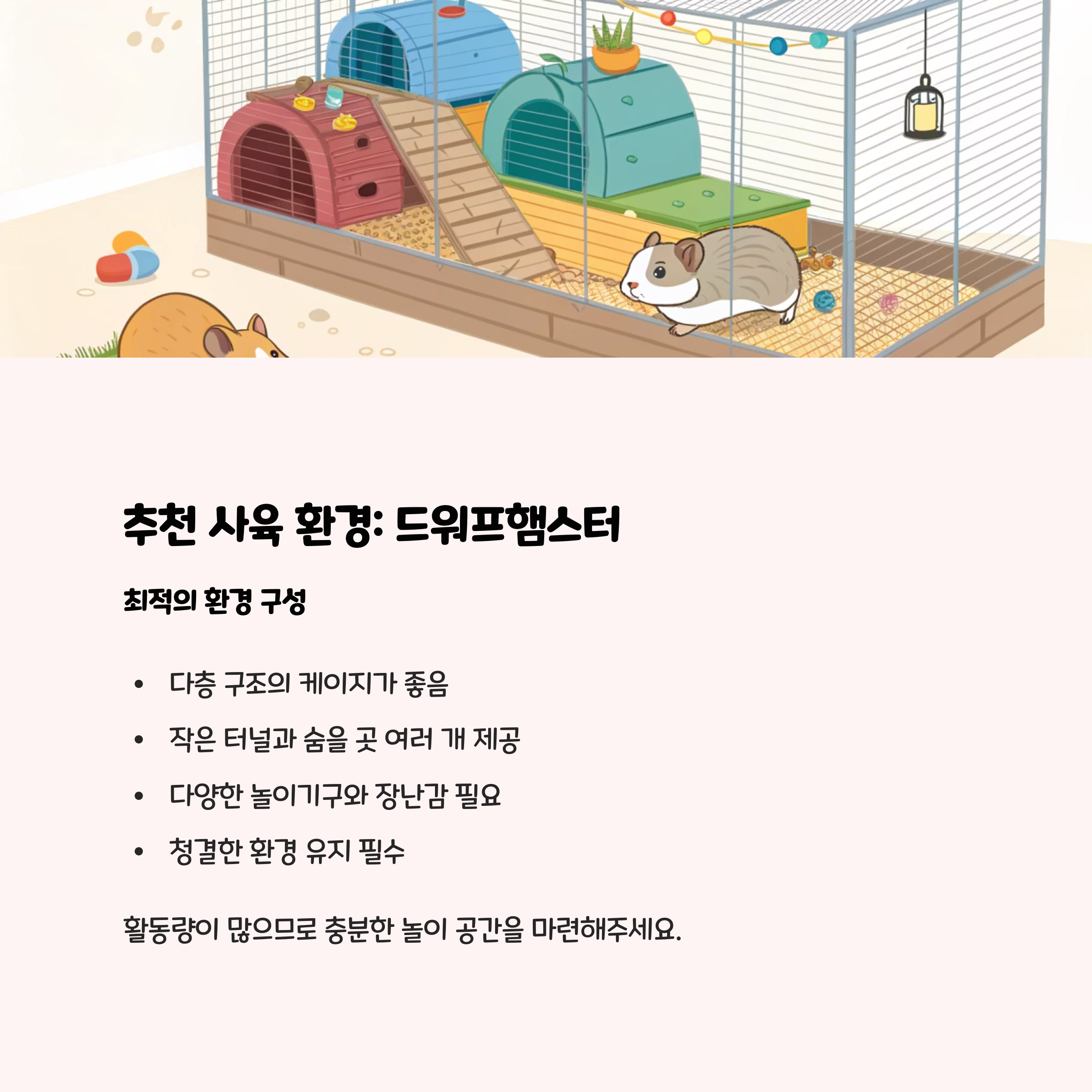 작은 크기로 공간 활용이 용이하며, 여러 마리를 함께 키울 수 있어 합사 케이지도 가능합니다. 활발해서 쳇바퀴와 터널 등 다양한 놀이기구를 자주 활용합니다. 다만, 예민한 개체는 합사 시 다툼이 있을 수 있으니 주의가 필요합니다.