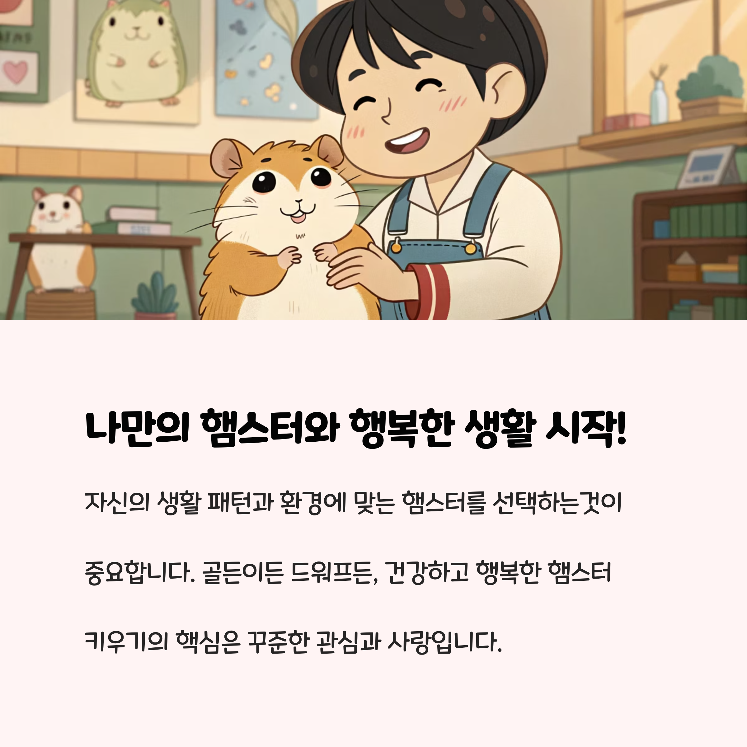 골든햄스터는 넓은 공간과 단독 사육이 가능하며, 차분한 반려동물을 원하는 분께 적합합니다. 드워프햄스터는 활발하고 사회적인 성격, 작은 공간에서 여러 마리를 키우고 싶은 분께 추천합니다. 두 품종 모두 야행성이므로 밤에 활동이 많고, 관리와 건강 체크에 세심한 관심이 필요합니다. 충분한 정보와 준비로 햄스터와 행복한 반려생활을 시작해 보세요!