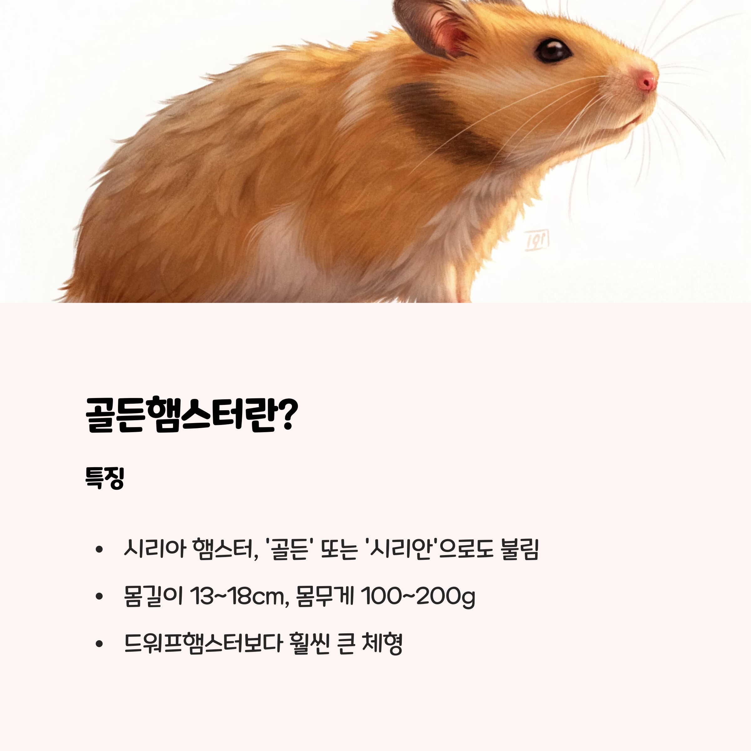 평균 몸길이 13~18cm, 몸무게 100~200g으로 드워프햄스터보다 훨씬 큽니다. 털 색은 황금색, 흰색, 검은색, 갈색 등 다양하며, 통통한 체형과 둥근 얼굴이 특징입니다.
