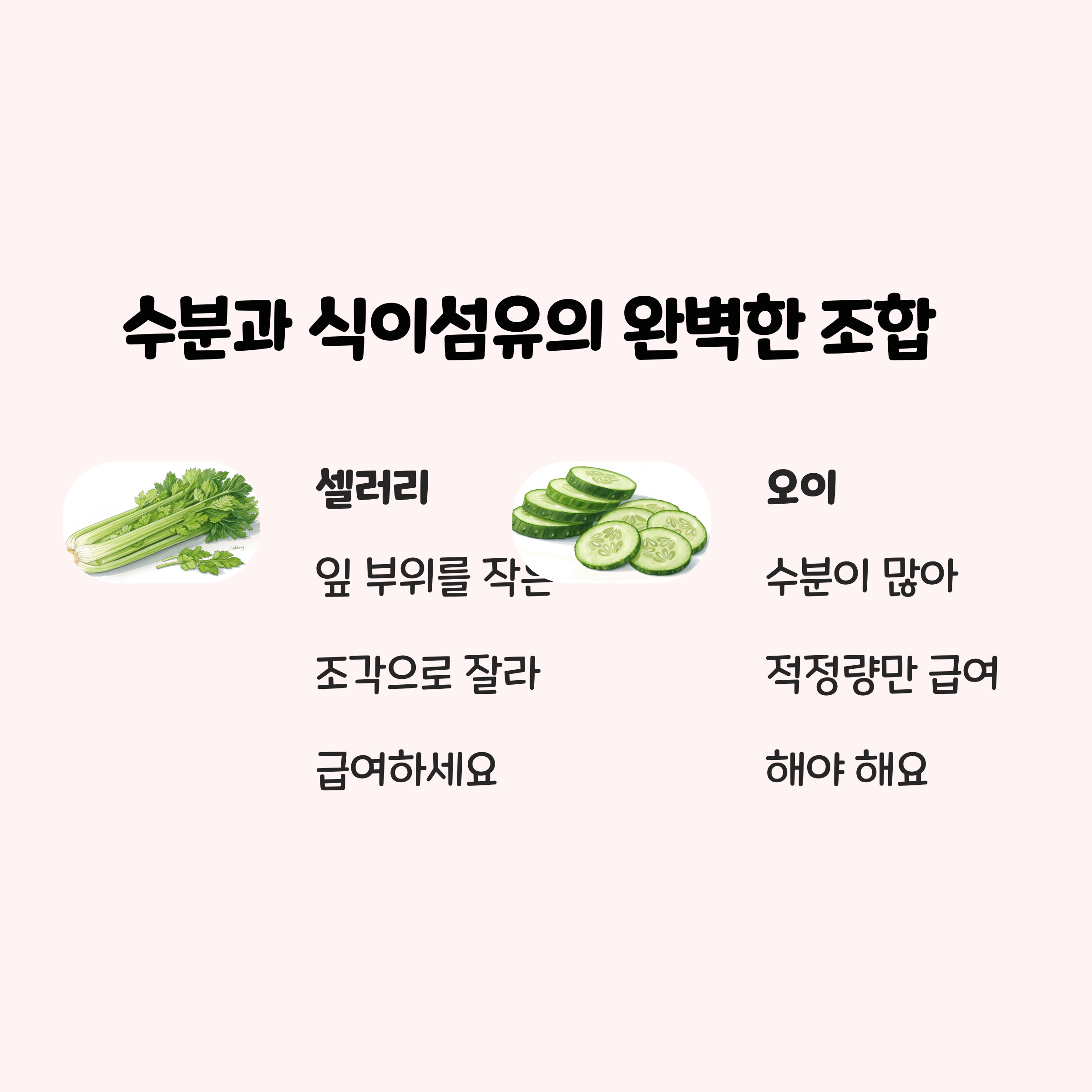 - 수분이 많아 여름철 수분 보충에 유리하지만, 과다 급여 시 설사를 유발할 수 있으니 소량(1~2조각)만 제공합니다.
