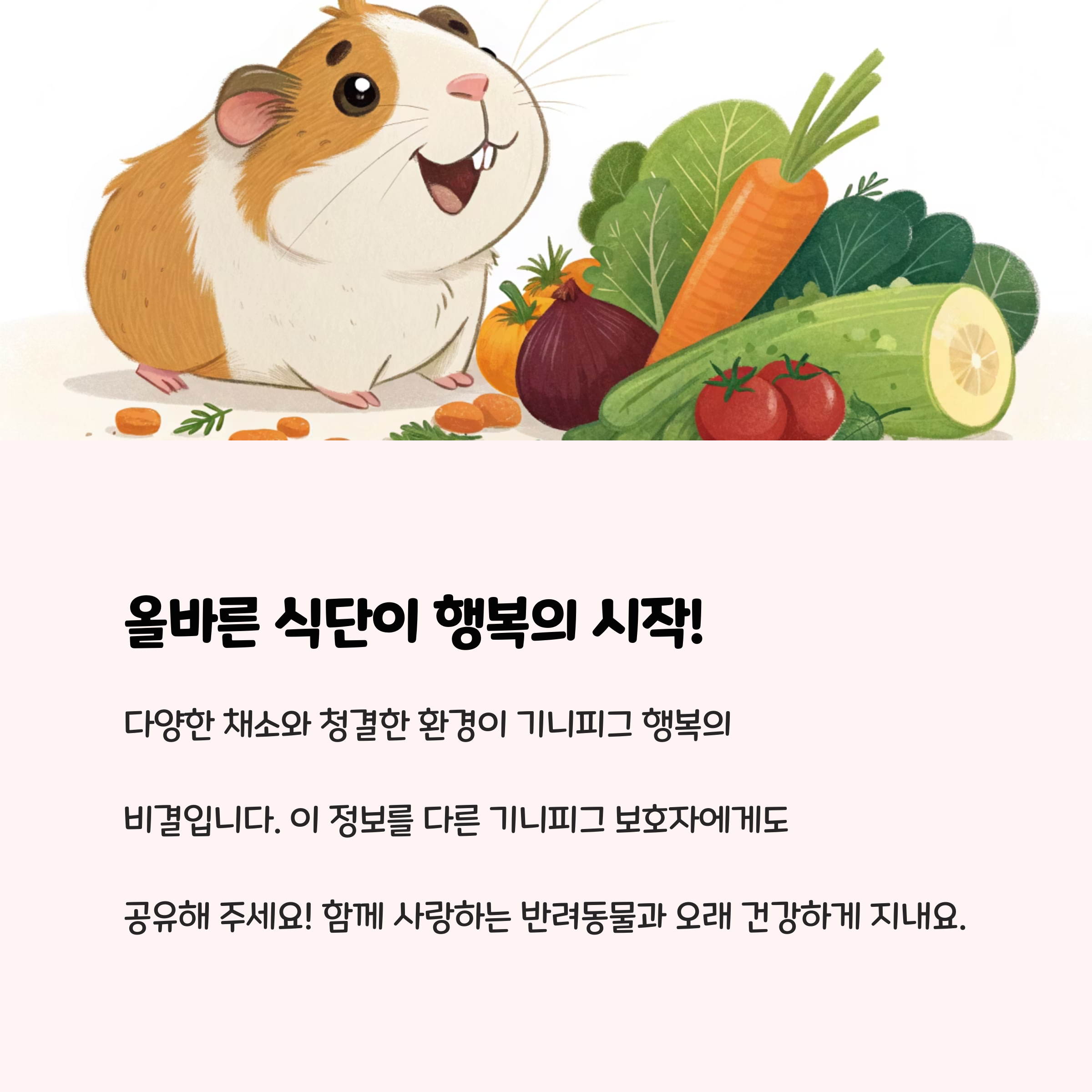 기니피그의 건강과 행복은 올바른 먹이 선택에서 시작됩니다. 비타민 C가 풍부하고, 섬유질이 많은 신선한 채소를 소량씩 다양하게 급여하고, 육류, 유제품, 양파류, 감자, 견과류, 가공식품 등은 절대 피해야 합니다. 이 기본 원칙만 철저히 지켜도, 기니피그와 오랜 시간 건강하게 함께할 수 있습니다.