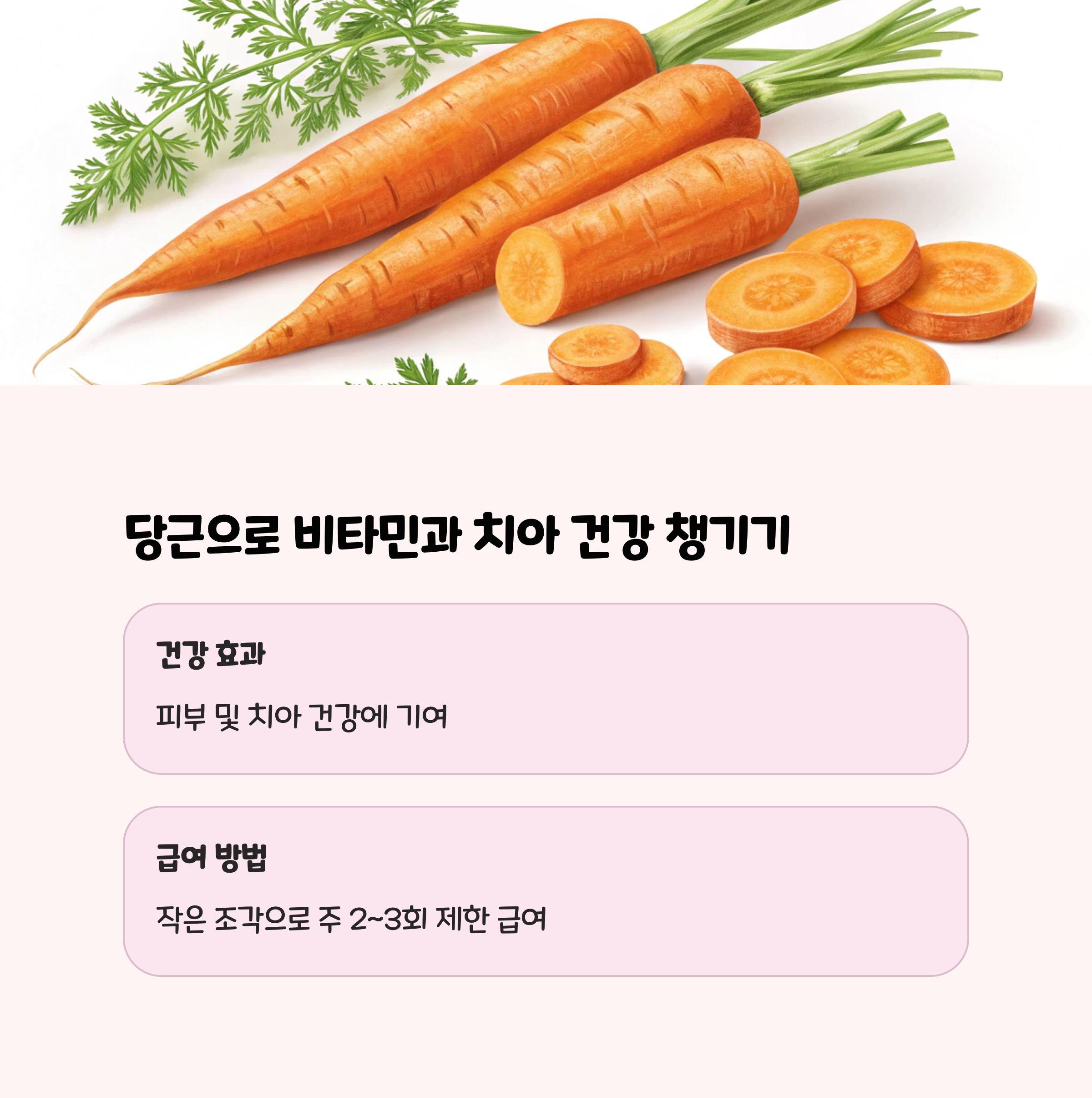 - 당분이 많으므로 주 2~3회, 한 조각(5g 내외)만 급여하세요.