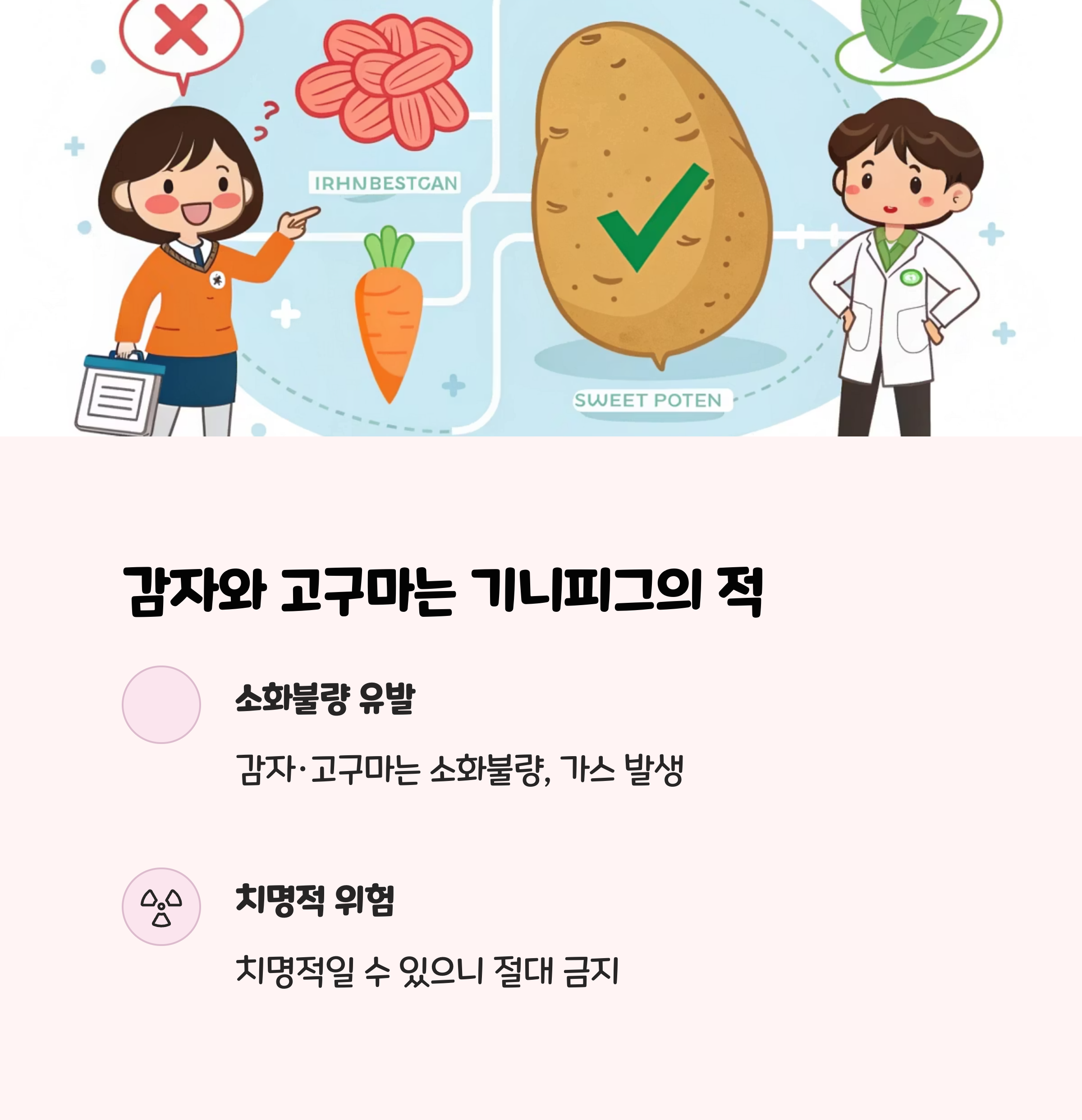 기니피그는 초식동물로, 섬유질과 비타민 C가 풍부한 식단이 필수입니다. 이들은 비타민 C를 체내에서 합성하지 못하므로, 음식으로 반드시 보충해야 하며, 부족할 경우 괴혈병, 잇몸 질환, 탈모, 심각한 면역 저하 등이 발생할 수 있습니다. 또한, 소화기관이 매우 민감해 잘못된 음식 섭취 시 설사, 구토, 심지어 생명까지 위협받을 수 있습니다.