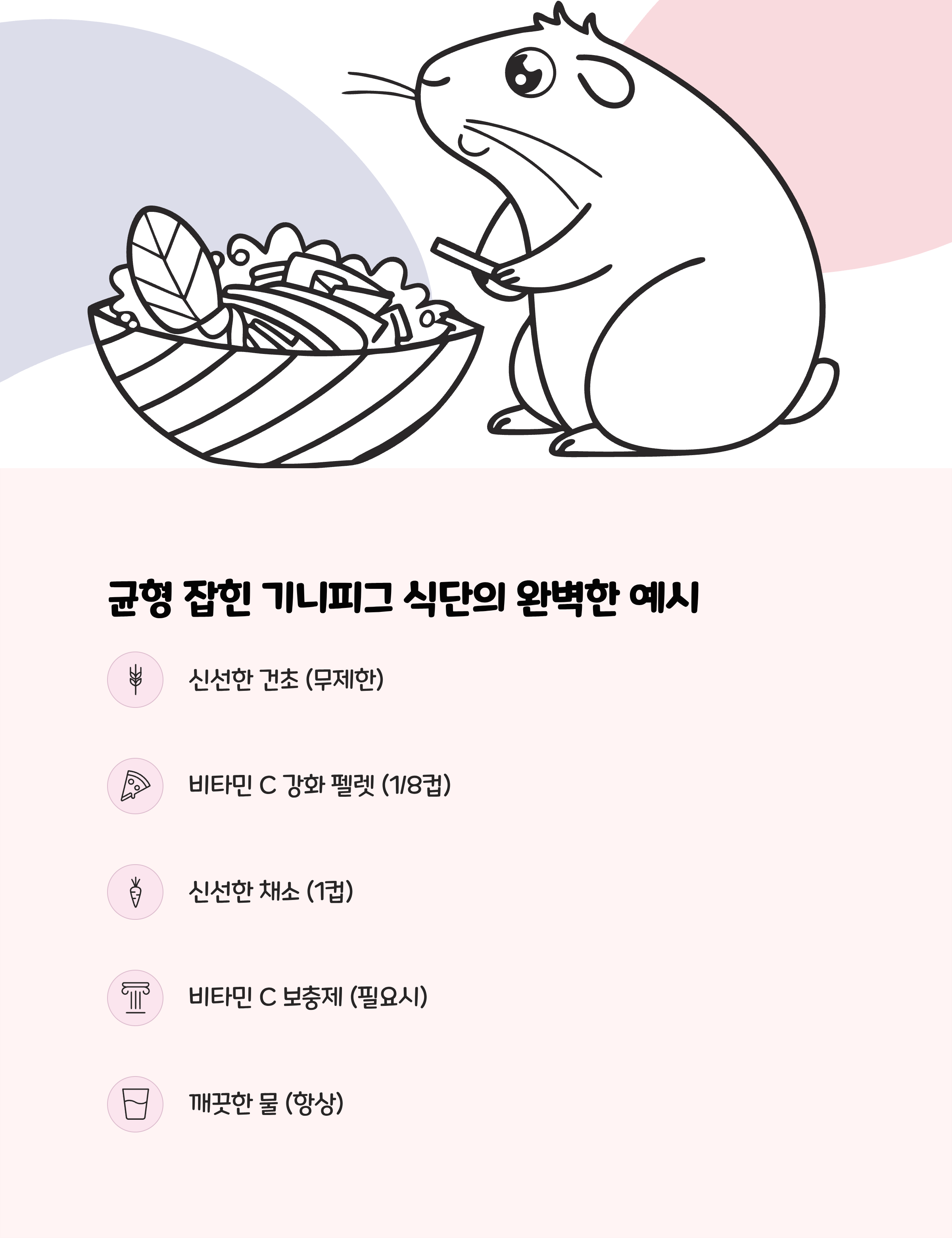 기니피그는 비타민 C를 스스로 합성할 수 없기 때문에, 매일 일정량을 반드시 음식이나 영양제로 보충해줘야 합니다. 부족할 시 괴혈병 등 심각한 질환이 발생할 수 있습니다.