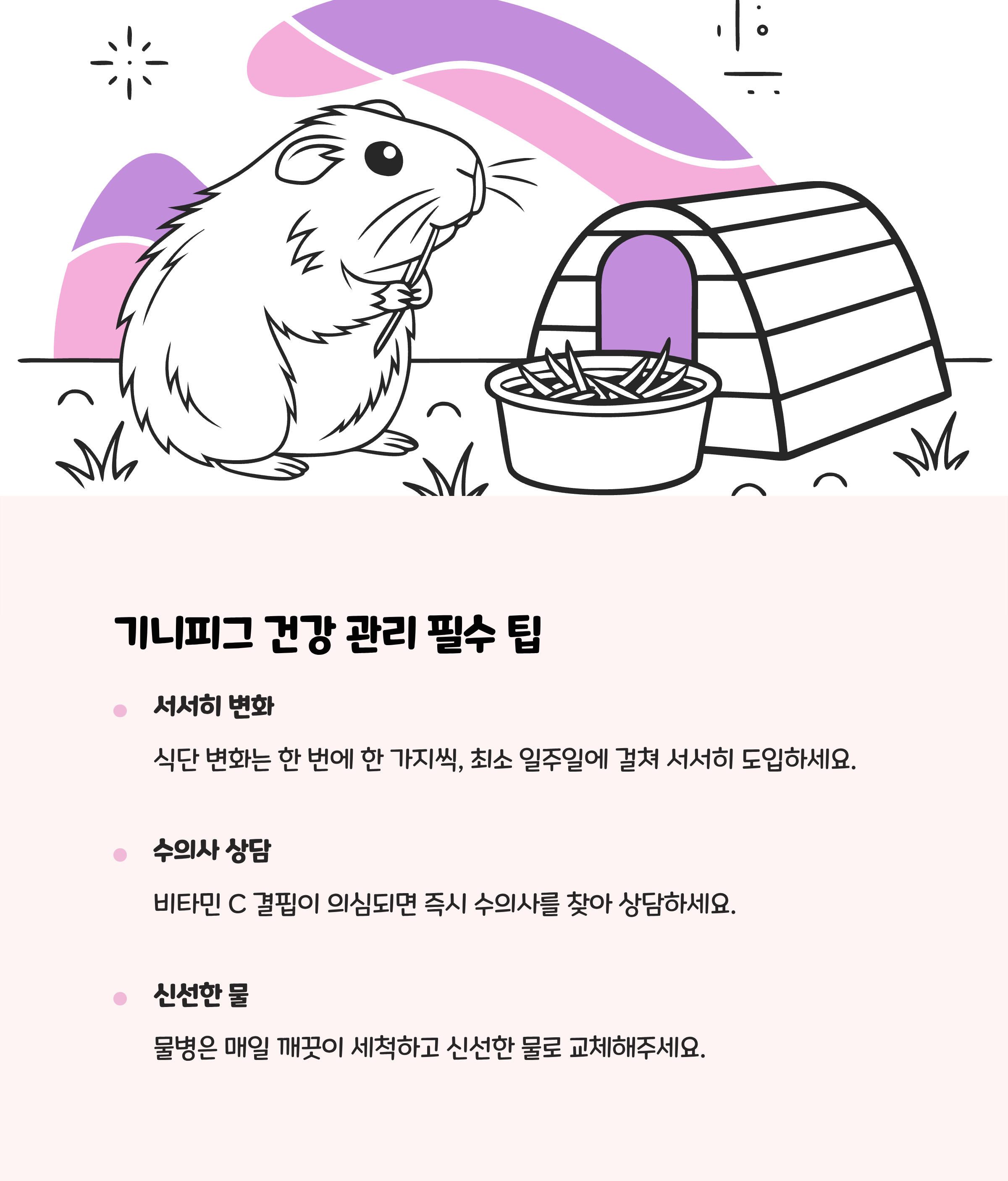 기니피그는 체내 비타민 C를 합성하지 못해 매일 20~40mg을 반드시 보충해야 합니다. 부족하면 괴혈병, 면역력 저하 등 심각한 건강 문제가 발생할 수 있습니다.