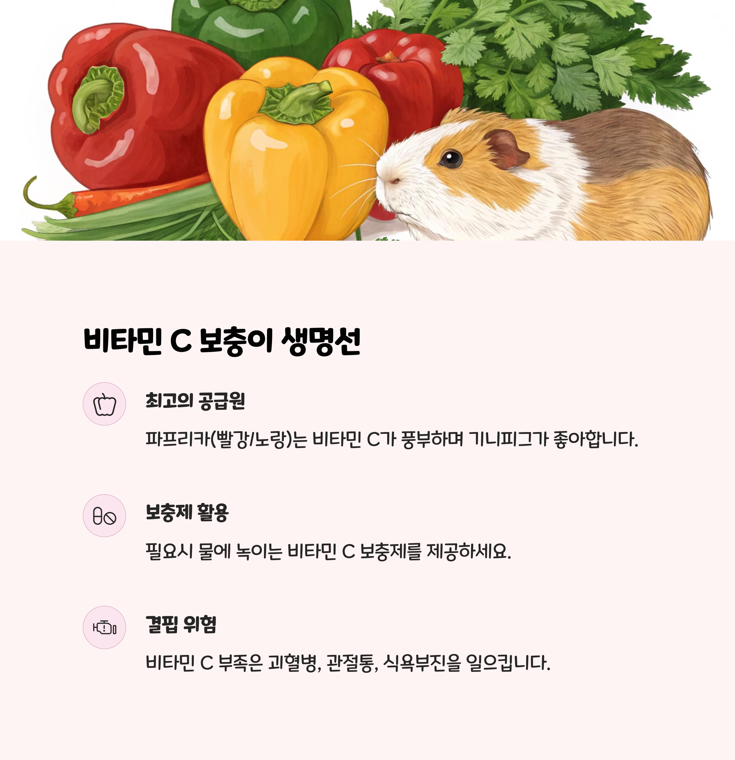 • 식단: 건초(티모시 등)와 신선한 채소, 비타민 C 보충이 필수. 기니피그는 비타민 C를 스스로 합성하지 못하므로, 매일 10~30mg/kg을 공급해야 합니다.