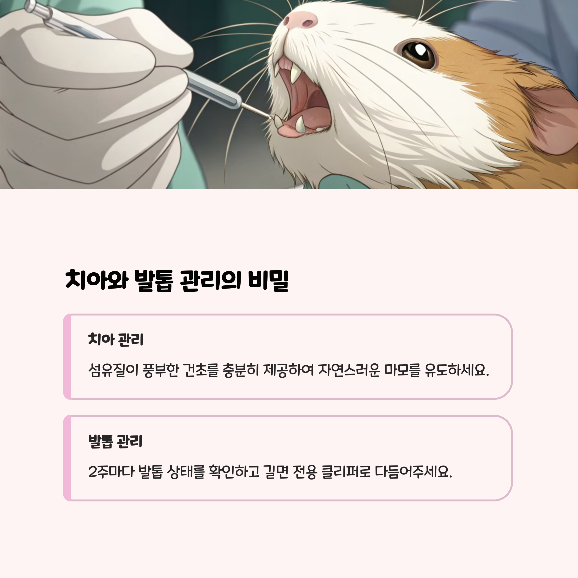• 치아와 발톱: 치아 과다 성장, 발톱 길이 체크