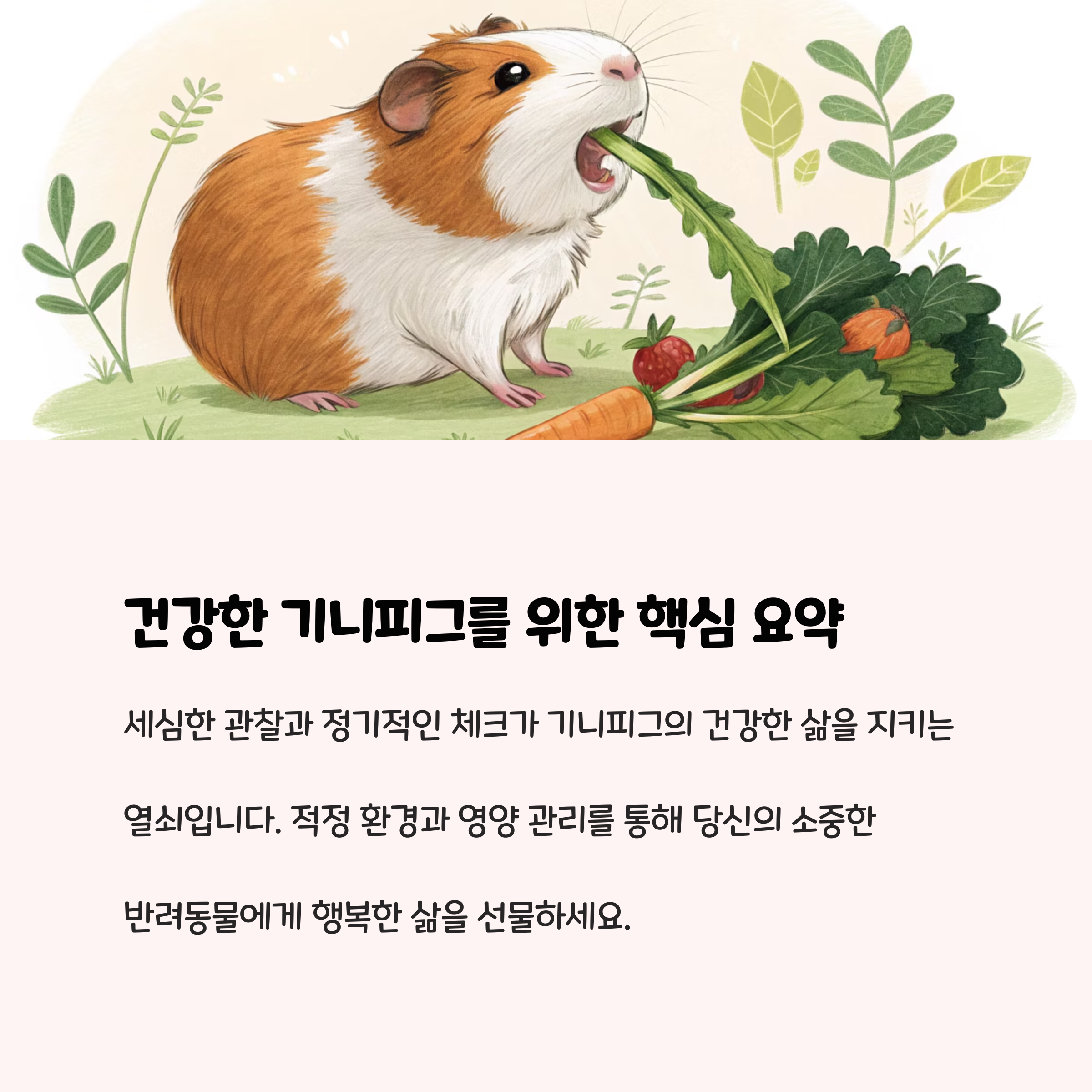 기니피그는 예방접종 대신, 정기적인 건강 체크와 환경·영양 관리가 핵심입니다. 작은 변화도 놓치지 않는 세심한 관찰과 꾸준한 관리만이 반려동물의 행복한 삶을 지킬 수 있습니다. 고민하지 마세요! 위의 체크리스트와 관리법을 실천하면, 여러분의 기니피그는 건강하게 오래오래 곁을 지켜줄 것입니다.