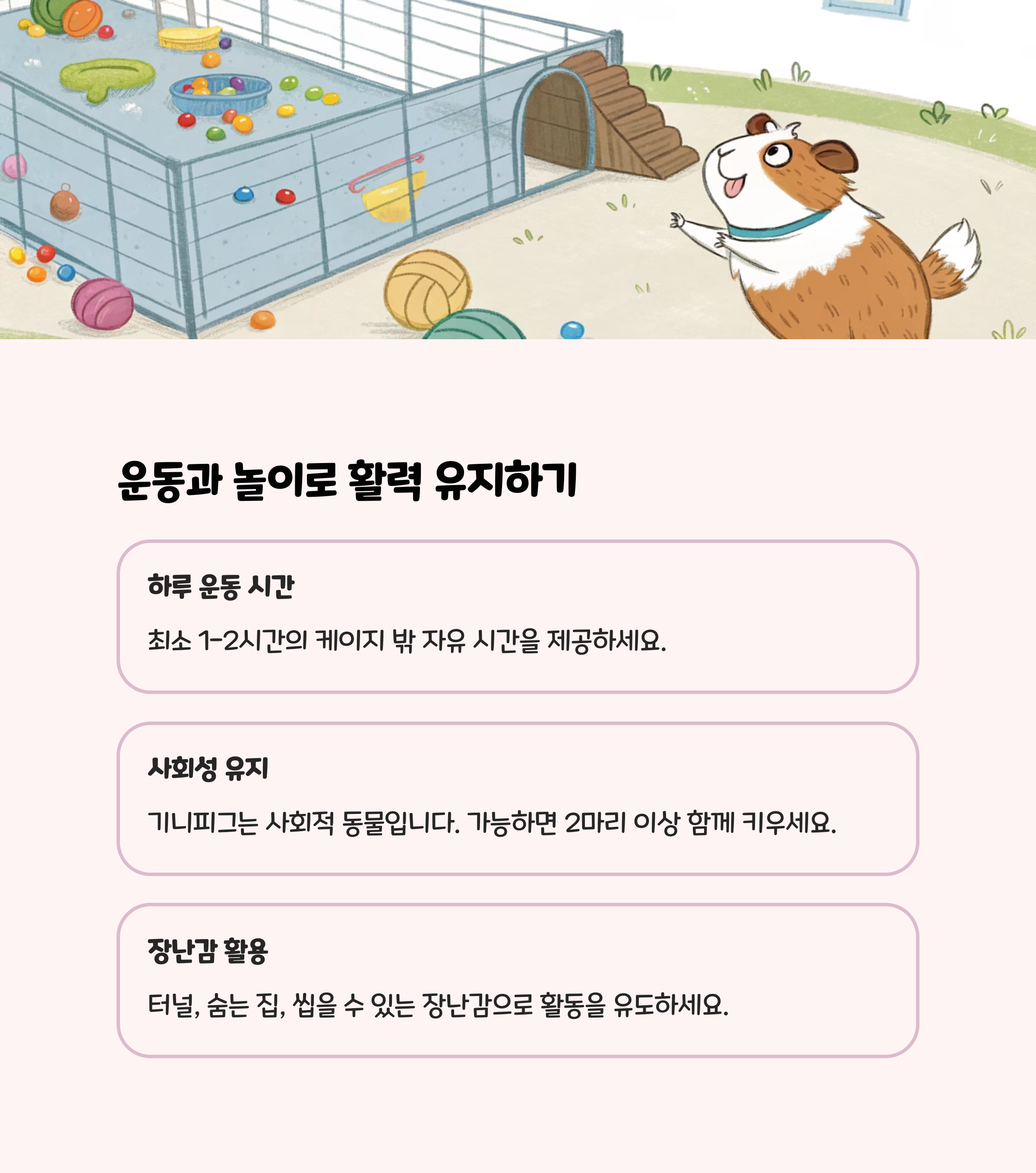 • 운동: 하루 20분 이상 자유롭게 움직일 수 있는 공간 제공