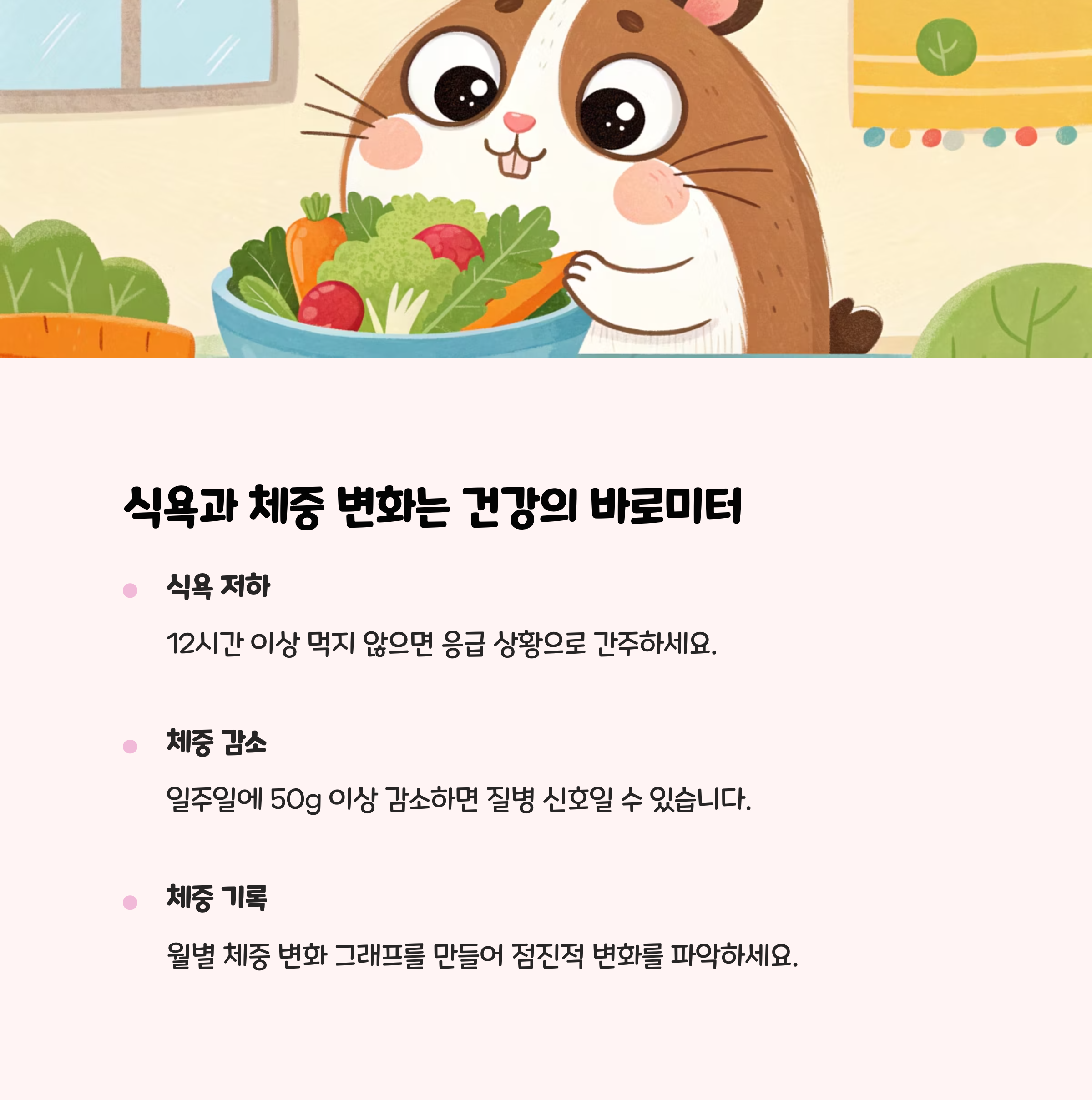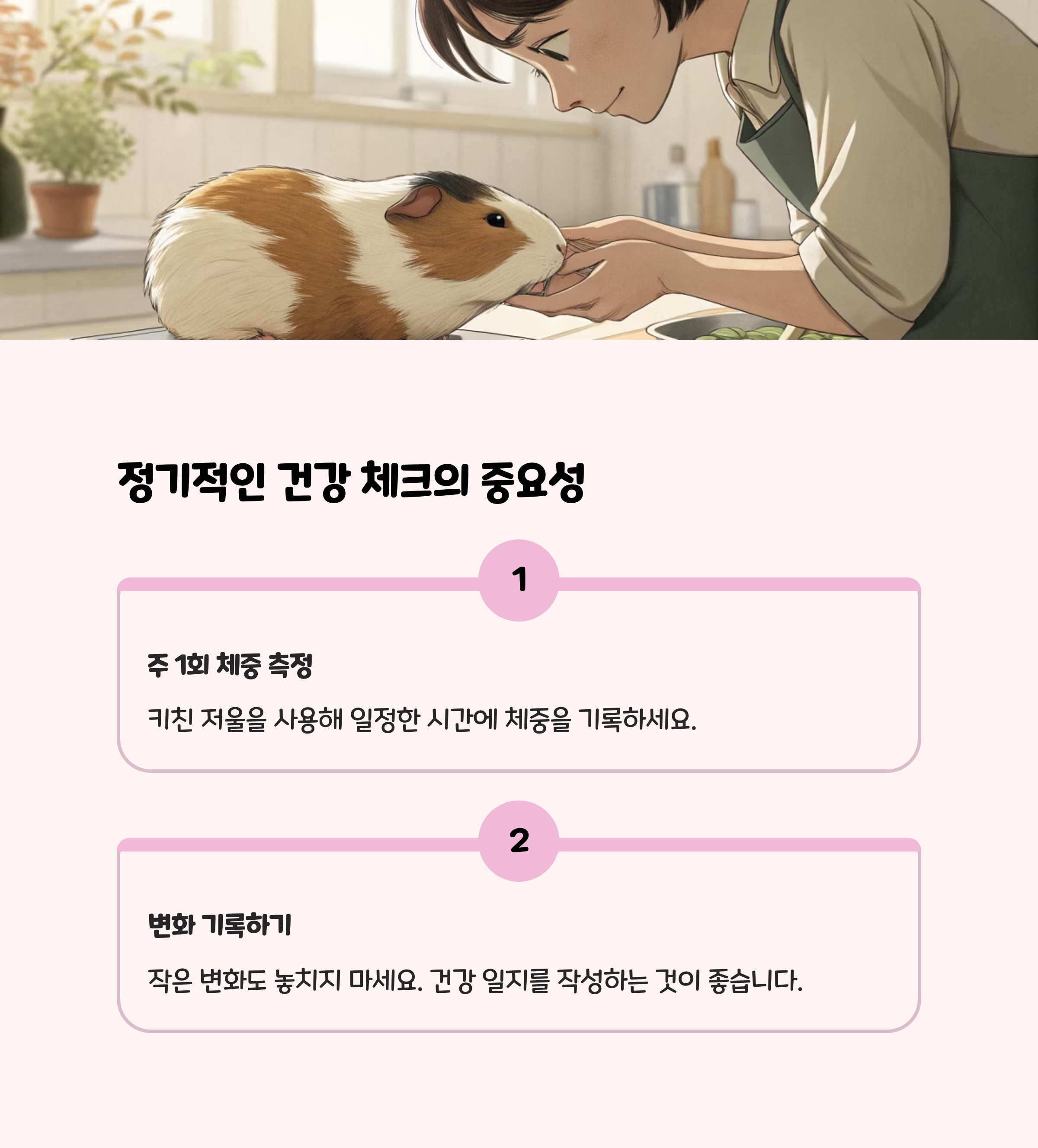 식욕과 체중 변화: 일주일에 한 번 몸무게 측정, 식욕 저하 시 즉각 확인배설물 상태: 대변이 정상인지, 설사나 변색이 없는지눈, 코, 입, 귀: 분비물이나 붓기, 상처 여부피부와 털: 탈모, 긁는 행동, 피부 발진 확인치아와 발톱: 치아 과다 성장, 발톱 길이 체크