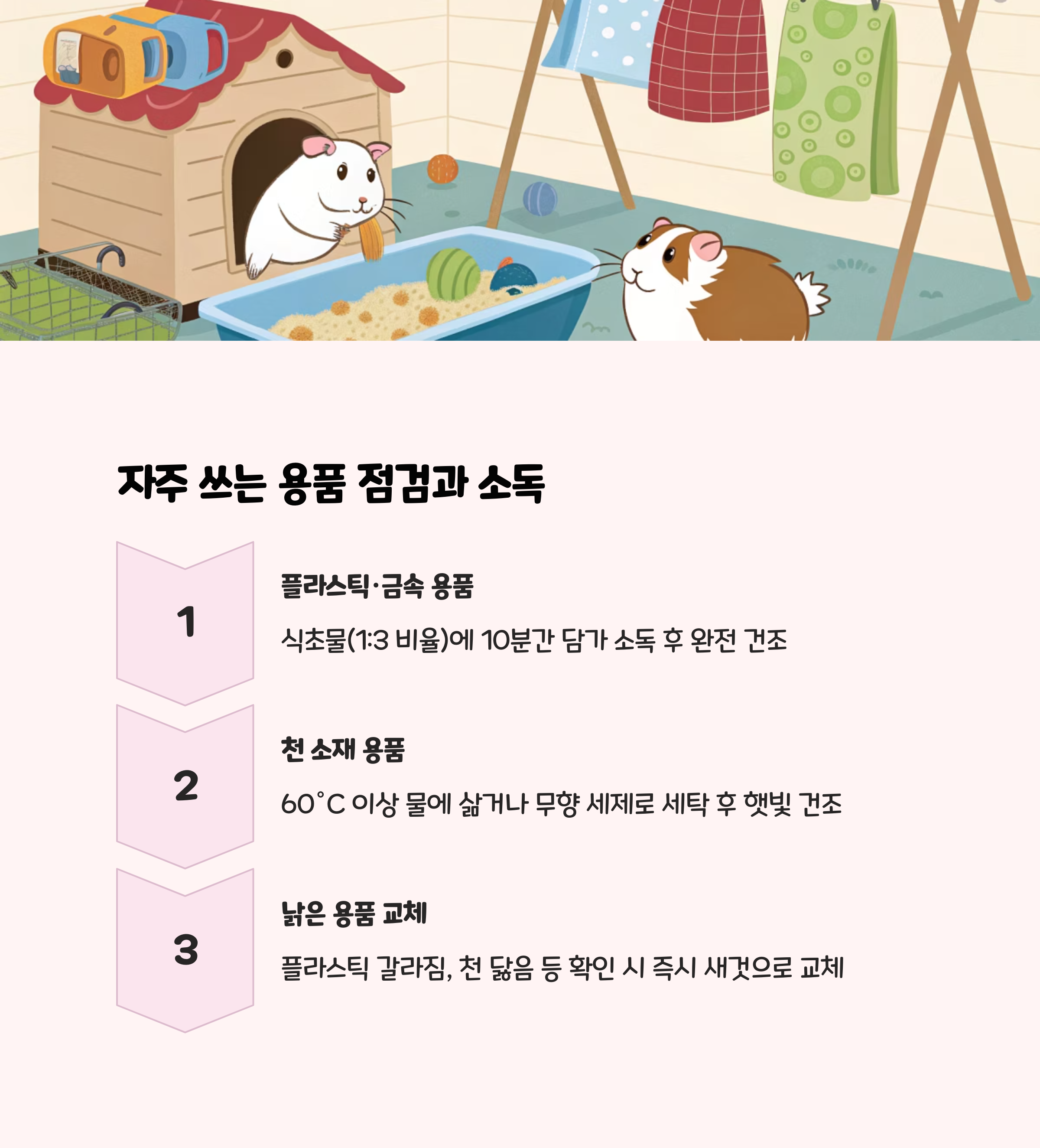 주 1회는 케이지 전체를 분리해 대청소를 하고, 월 1회 이상은 모든 용품을 삶거나 소독해 주는 것이 좋습니다.